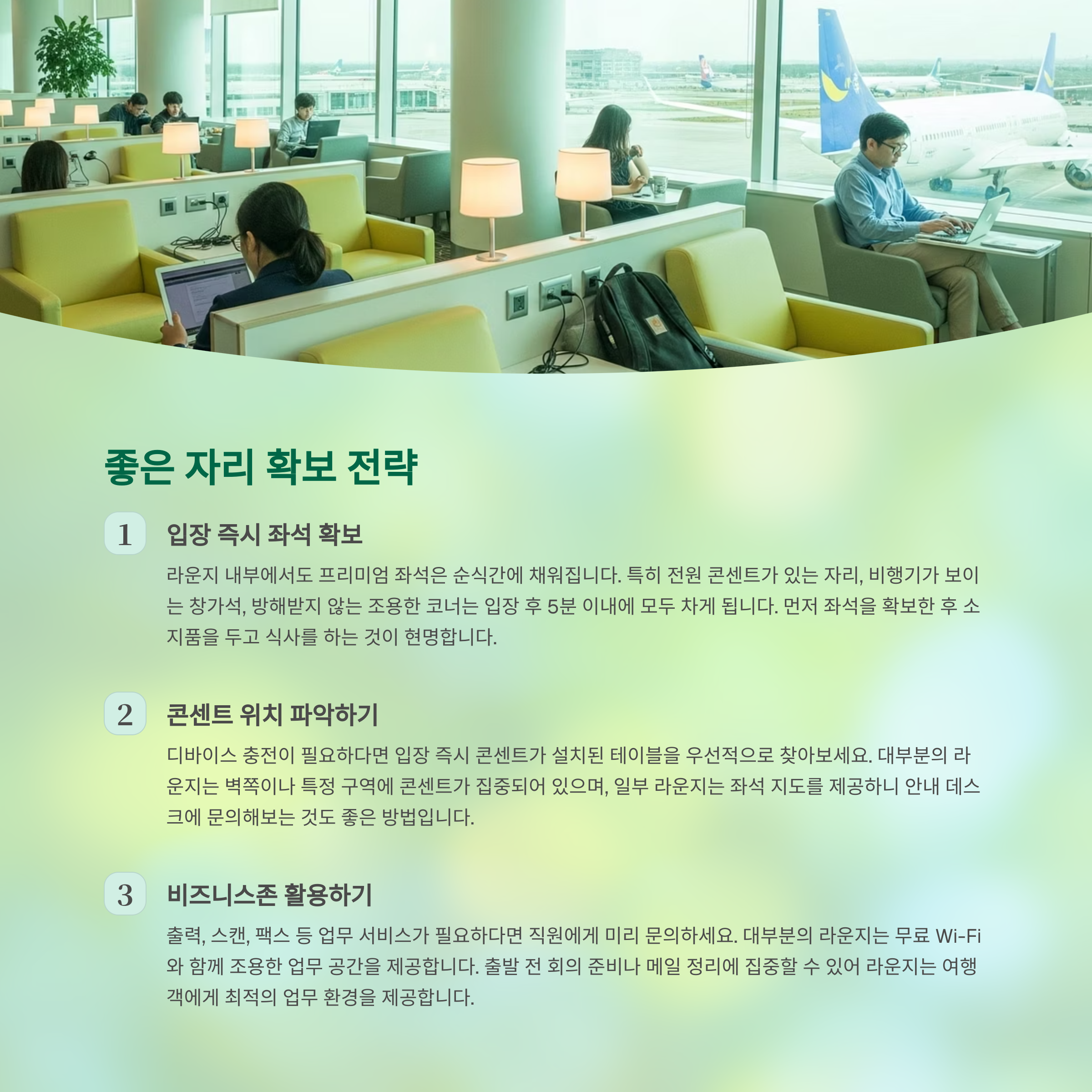 ✔ 라운지 도착 전에 화장실·환전 등 필수 업무를 미리 마치는 게 좋아요