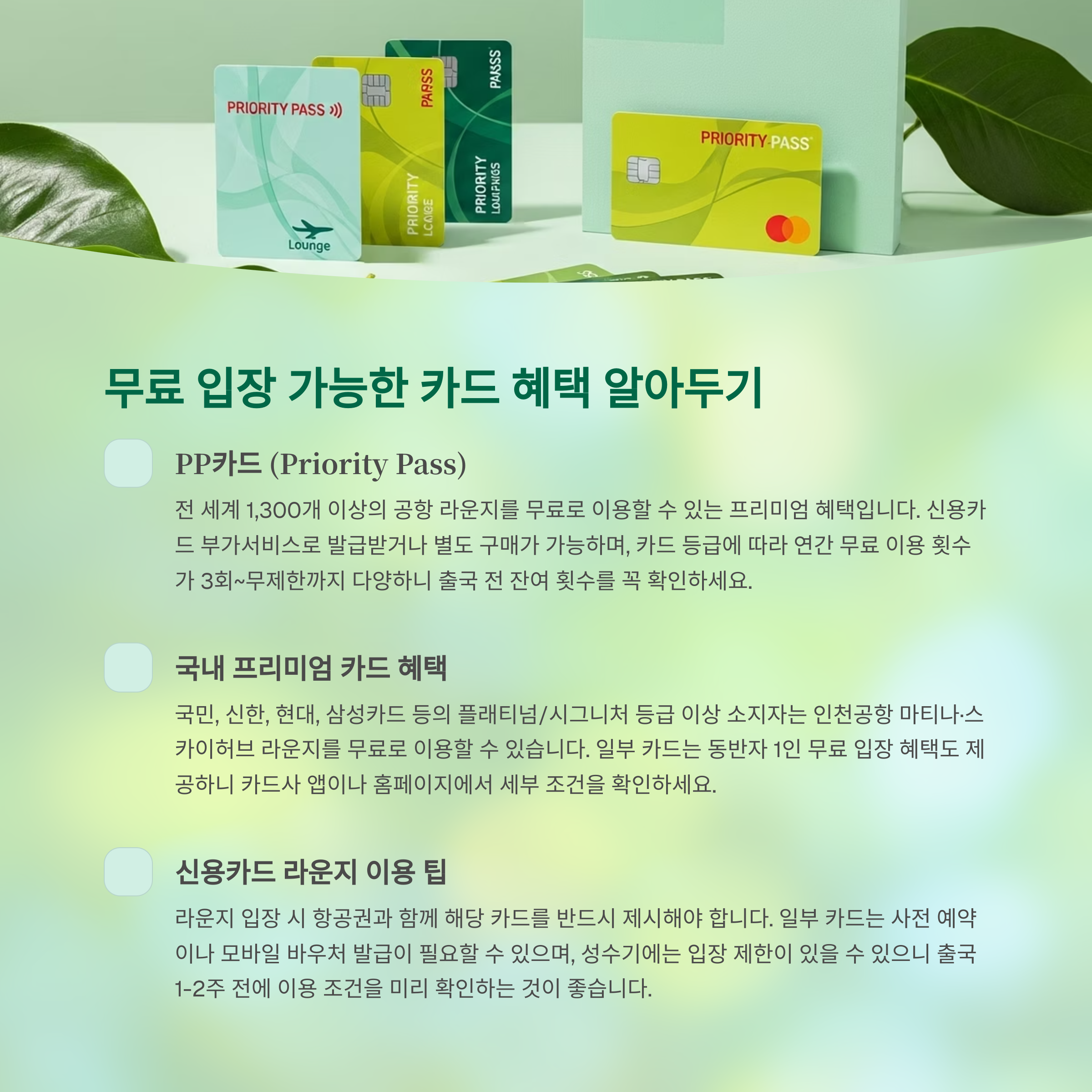 - PP카드 (Priority Pass): 다양한 국제선 라운지 무료 이용