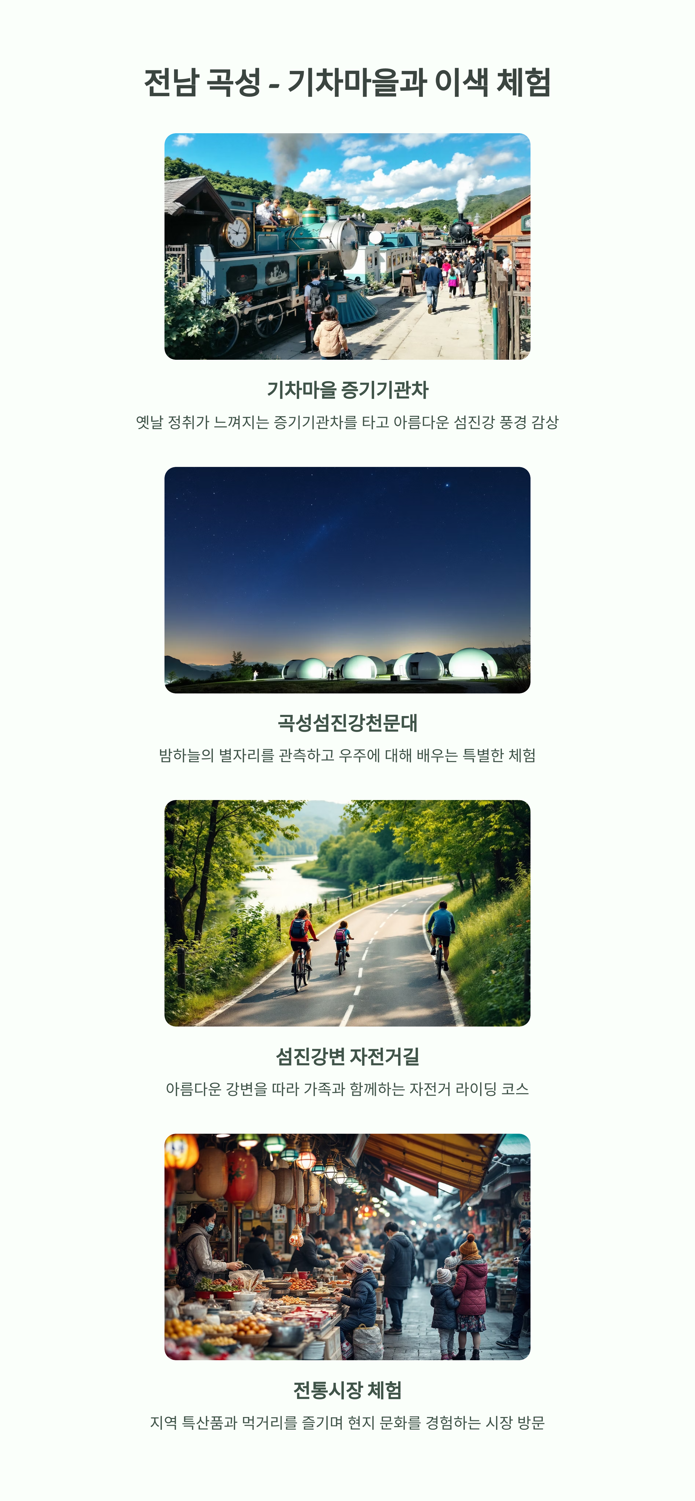 기차마을 증기기관차, 곡성섬진강천문대, 치유 숲 체험장 등