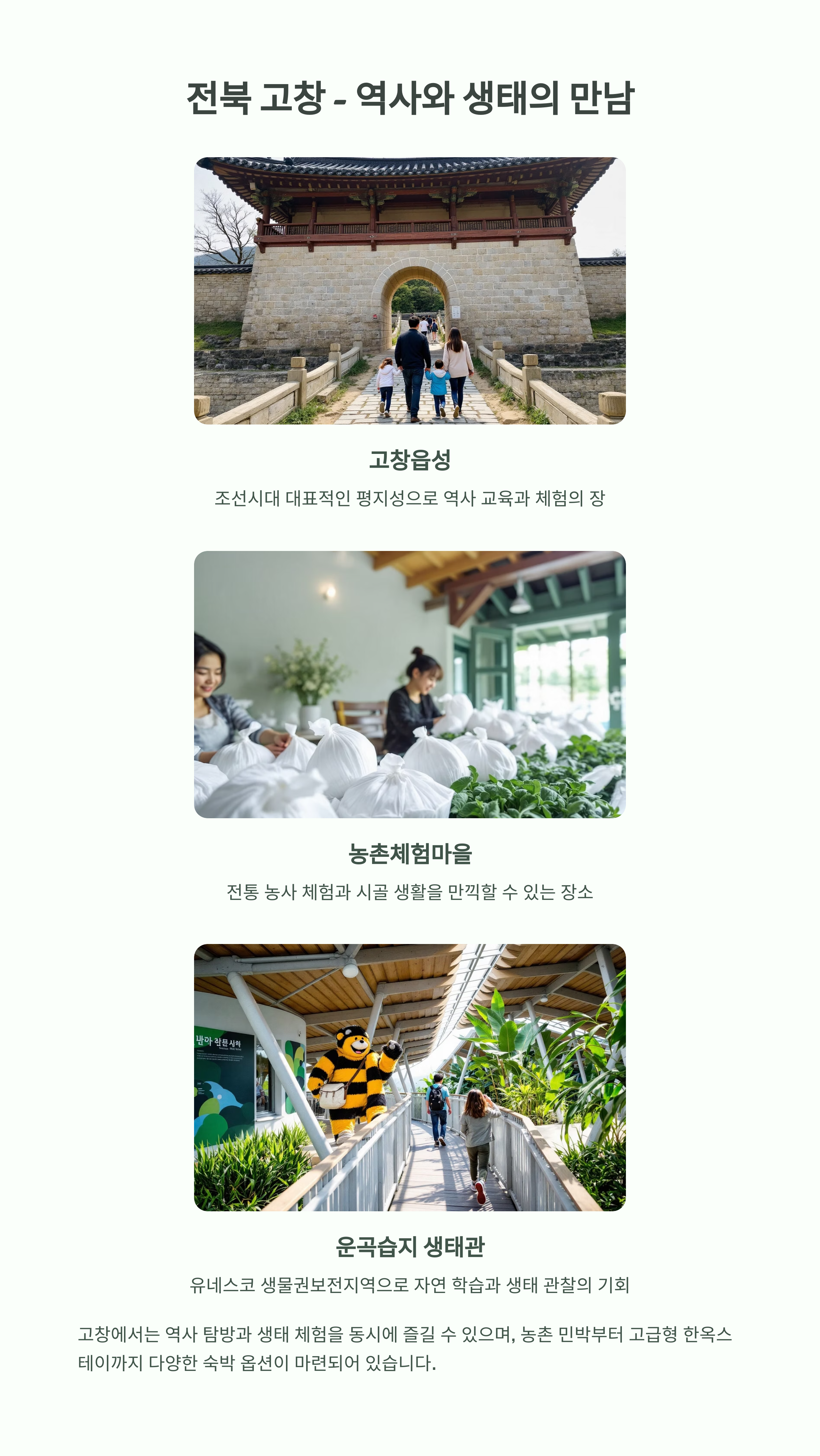 | 전북 고창 | 생태학습, 한옥 체험 | 한옥스테이 | 역사+환경 교육 |
