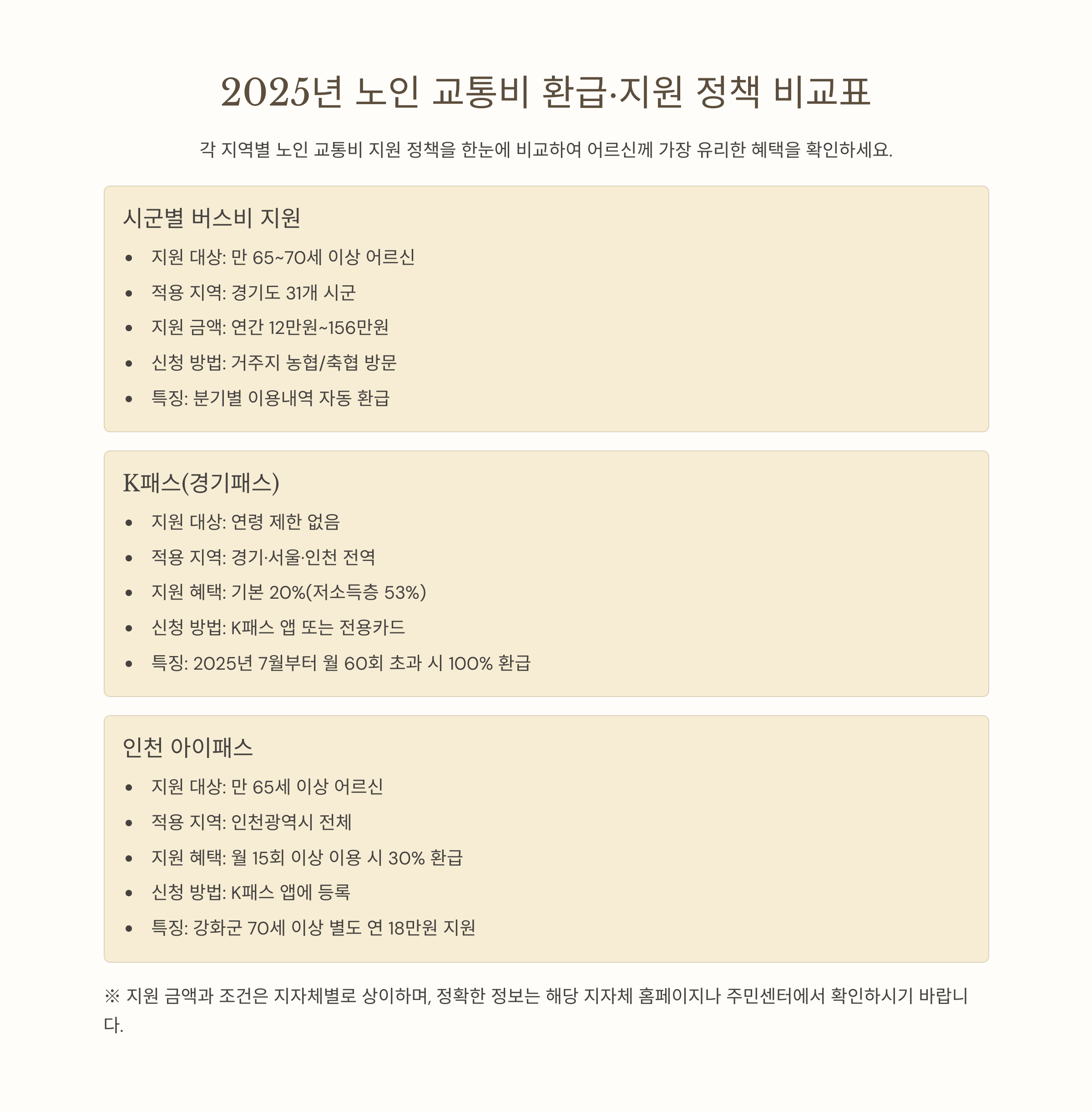 6. 2025년 기준, 노인 교통비 환급·지원 정책 비교표