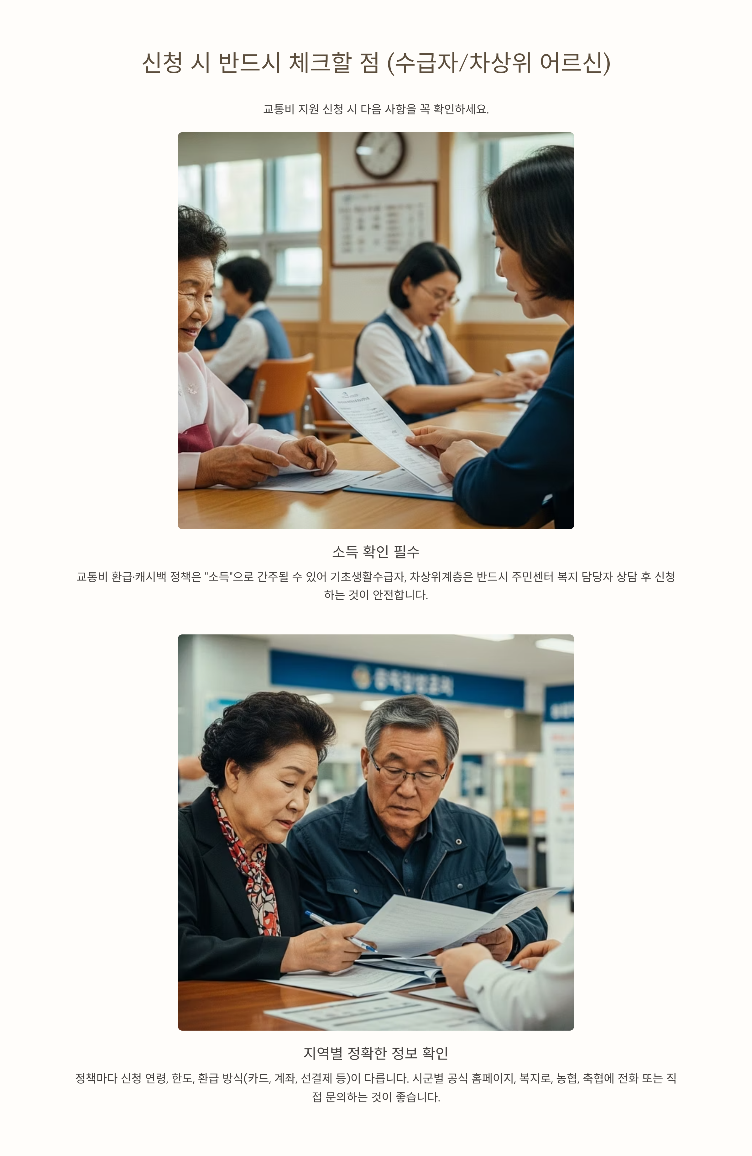 기초생활수급자, 차상위계층은 반드시 주민센터 복지 담당자 상담 후 신청하는 것이 안전해요. - 정책마다 신청 연령, 한도, 환급 방식(카드, 계좌, 선결제 등) 다르니