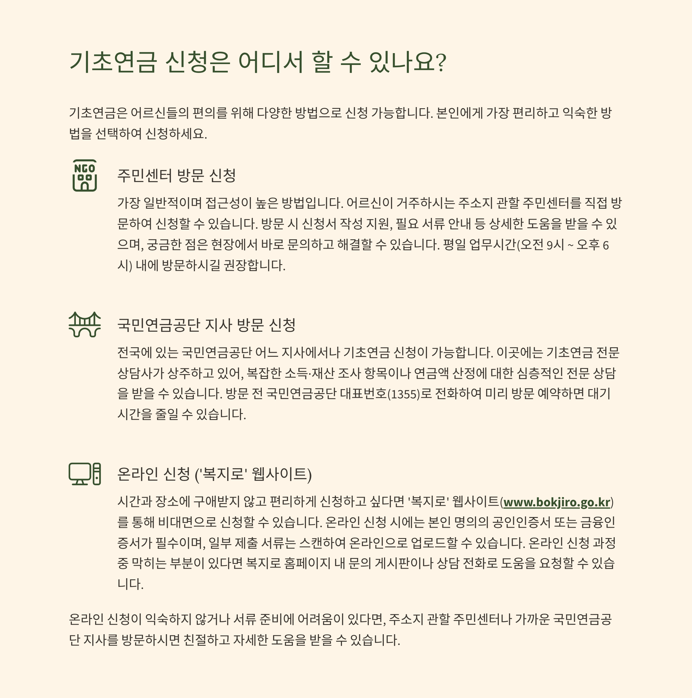 신청 장소: 주민센터 또는 국민연금공단, 온라인은 복지로에서 가능해요.