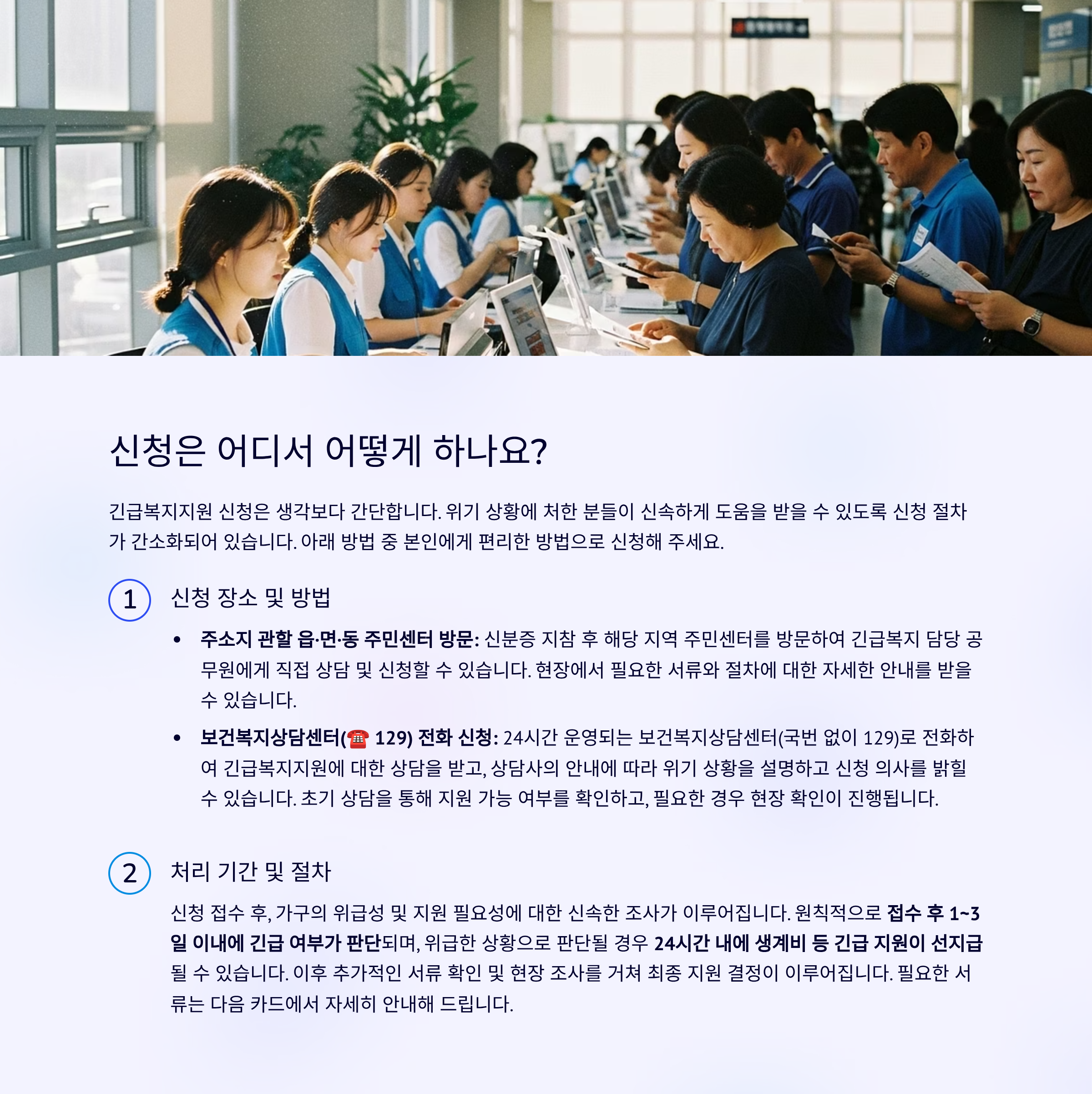 신청은 주소지 관할 읍·면·동 주민센터 또는 보건복지상담센터(☎ 129)를 통해 가능해요.