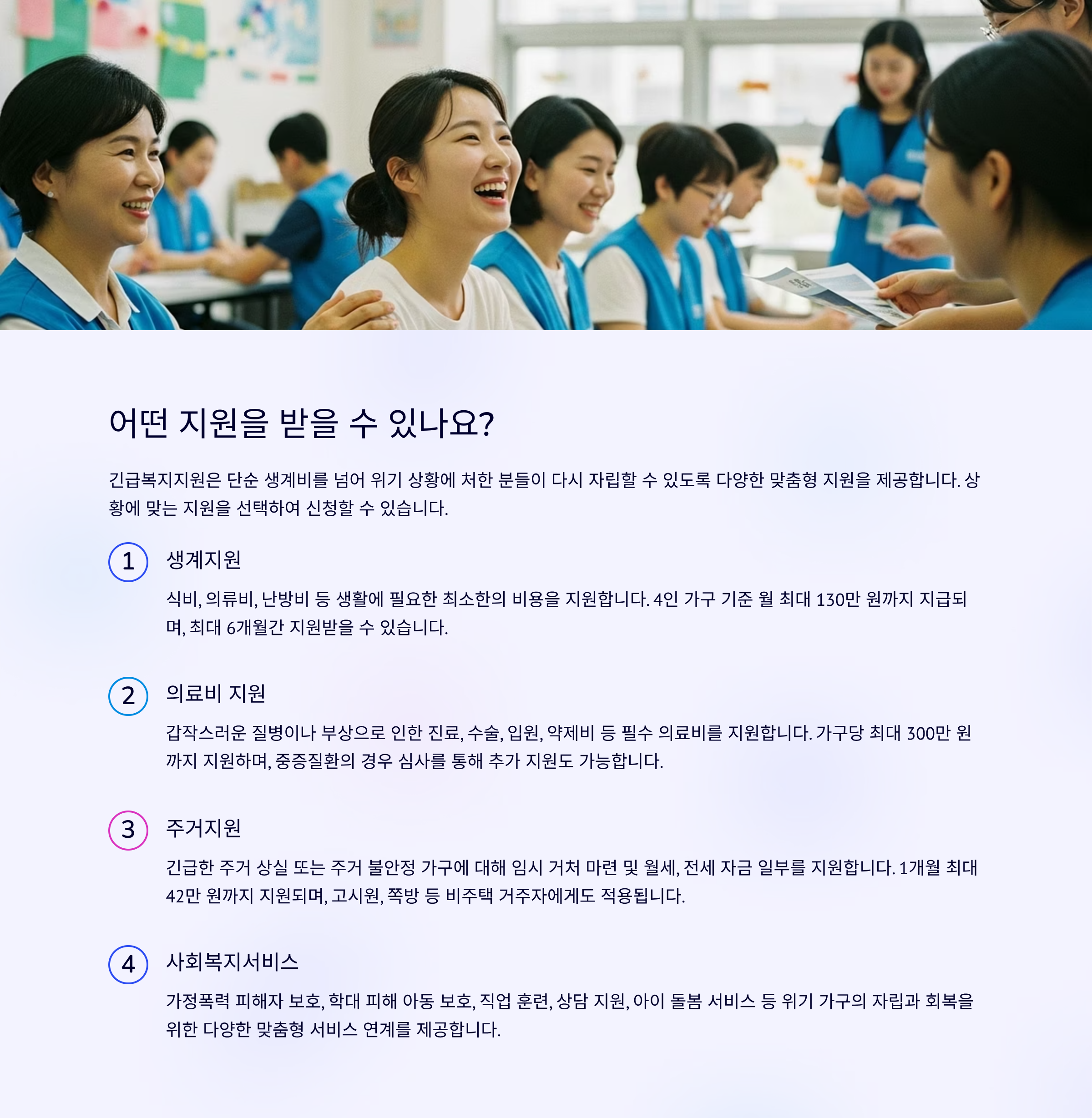 | 생계지원 | 4인 가구 기준 130만 원 | 최대 6개월까지 가능 |