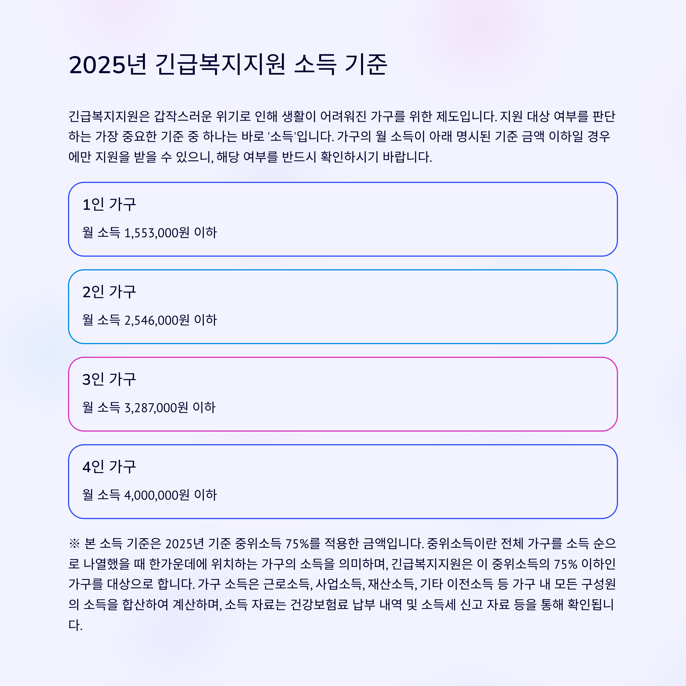 오늘은 갑작스러운 위기 상황에서 받을 수 있는 2025년 긴급복지지원 제도의 소득 기준과 신청 방법에 대해 자세히 알려드릴게요.