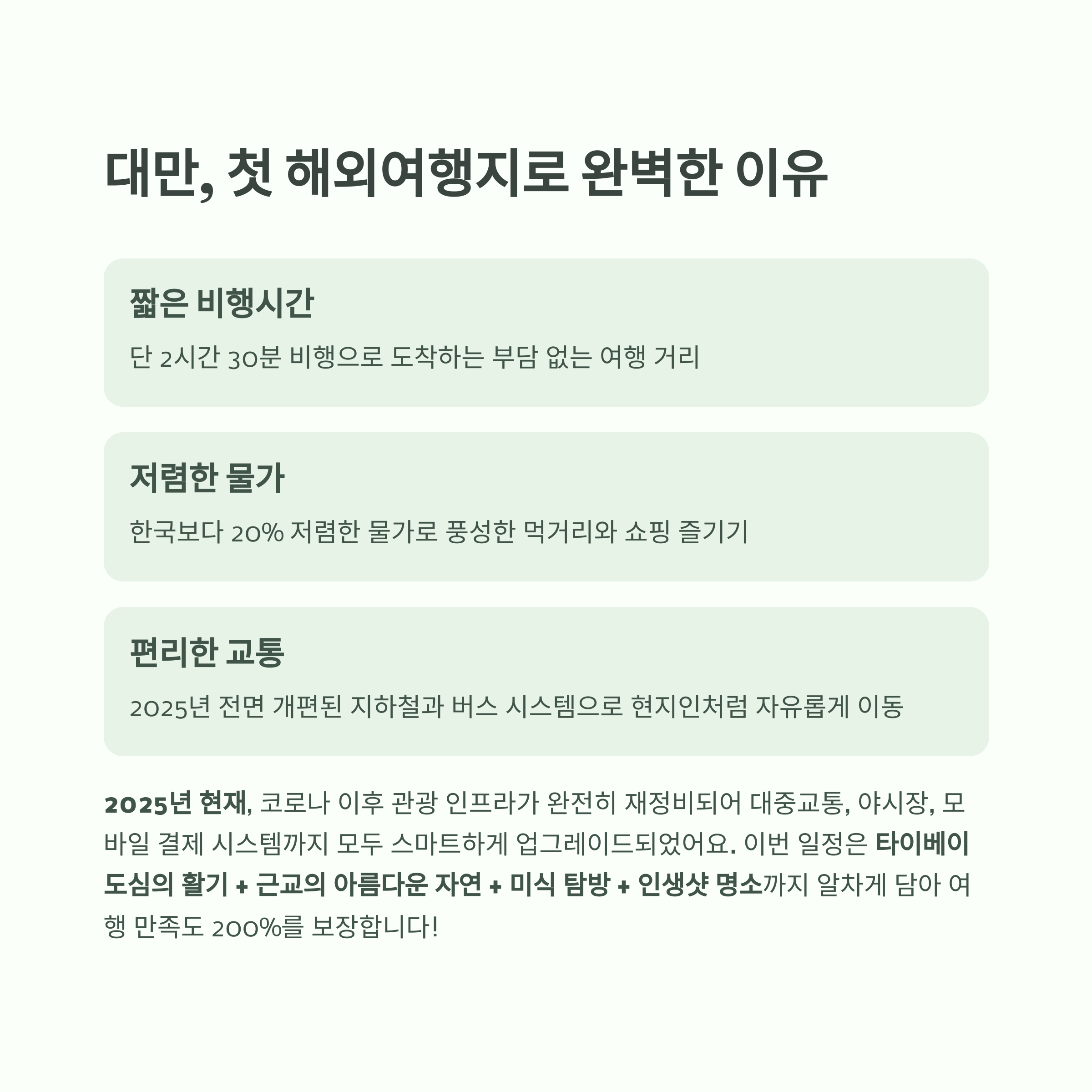 대만은 비행 시간 2시간 30분, 물가 저렴, 교통 편리, 먹거리 풍부
