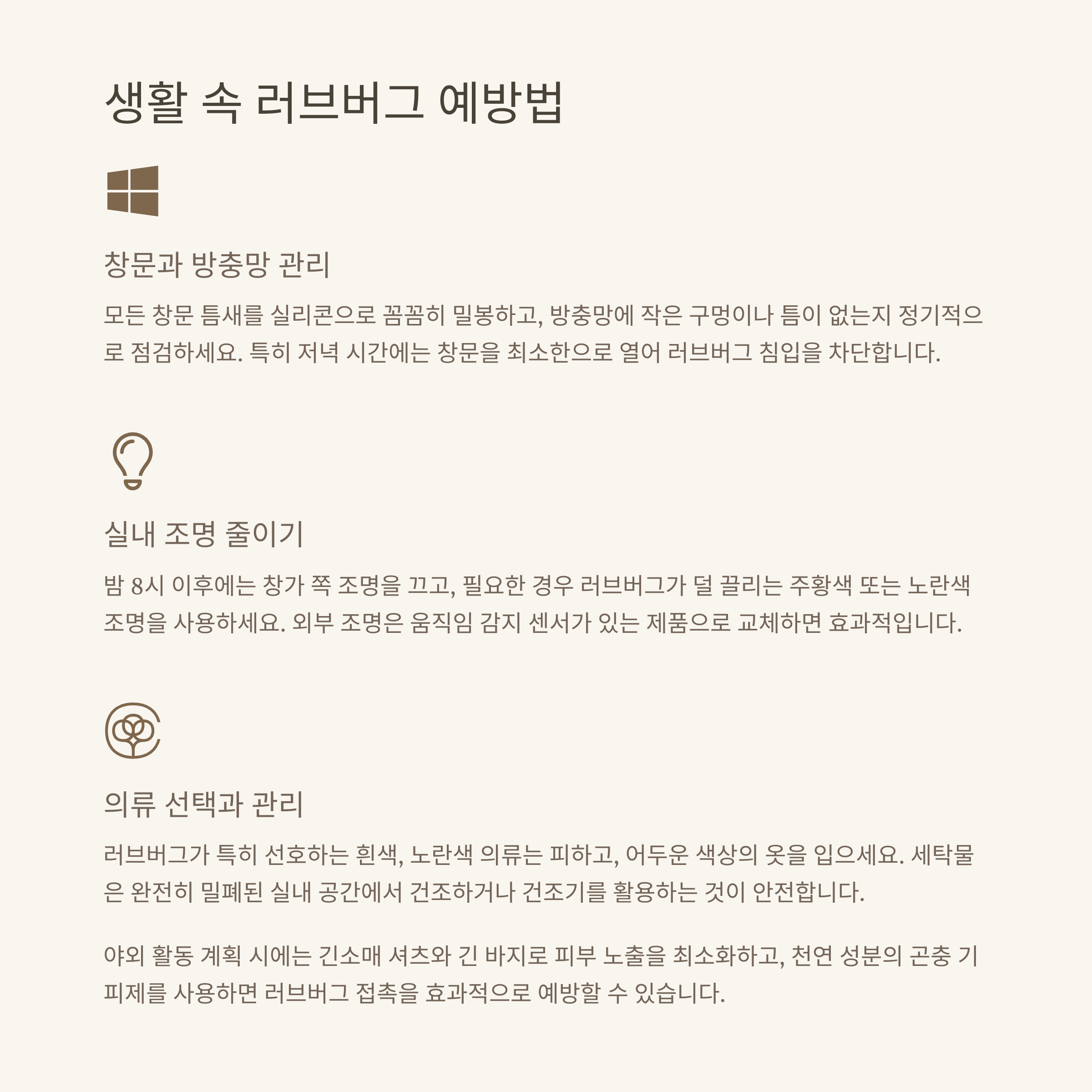 | 실내 조명 줄이기 | 밤에는 불빛을 최소화해 곤충 유입 차단 |