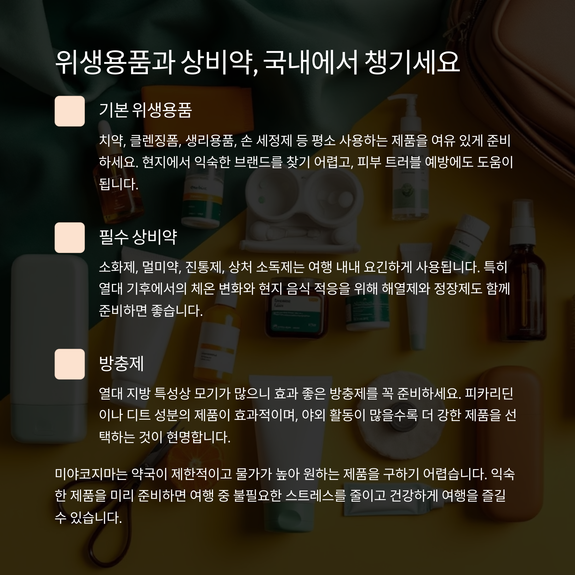 위생용품과 상비약은 현지보다 국내 준비가 안전