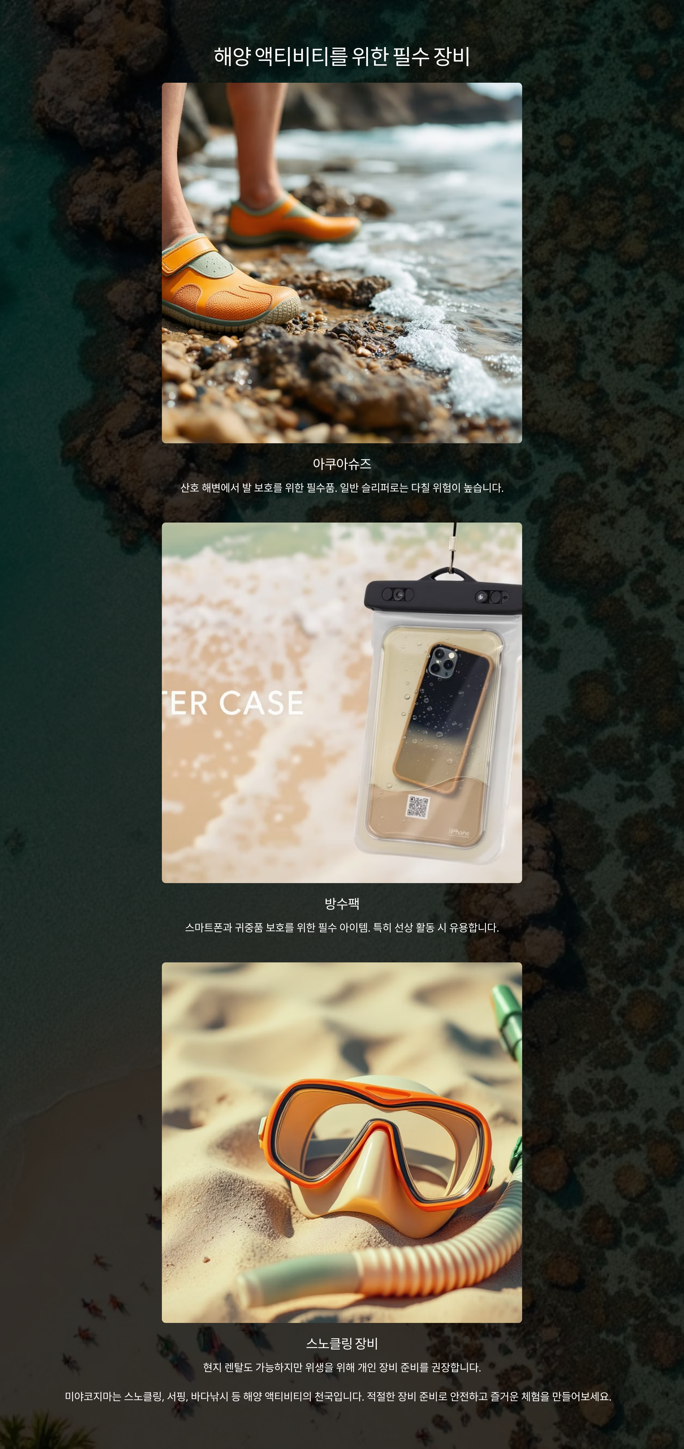 | 아쿠아슈즈 | 필수 | 산호 해변에선 일반 슬리퍼 착용 위험 있음 |