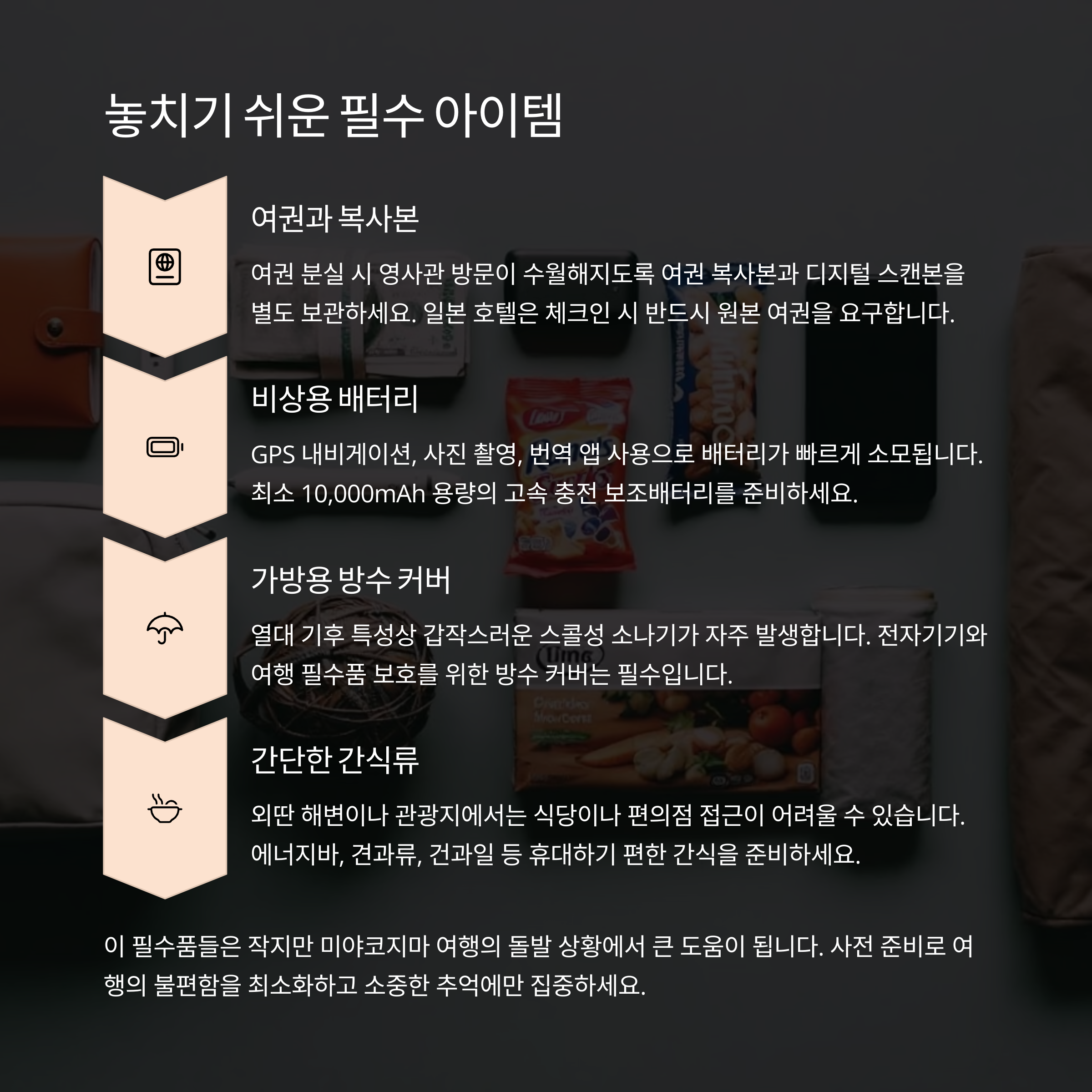 | 비상용 배터리 | 지도·번역 앱 사용 많아 충전 필수 |