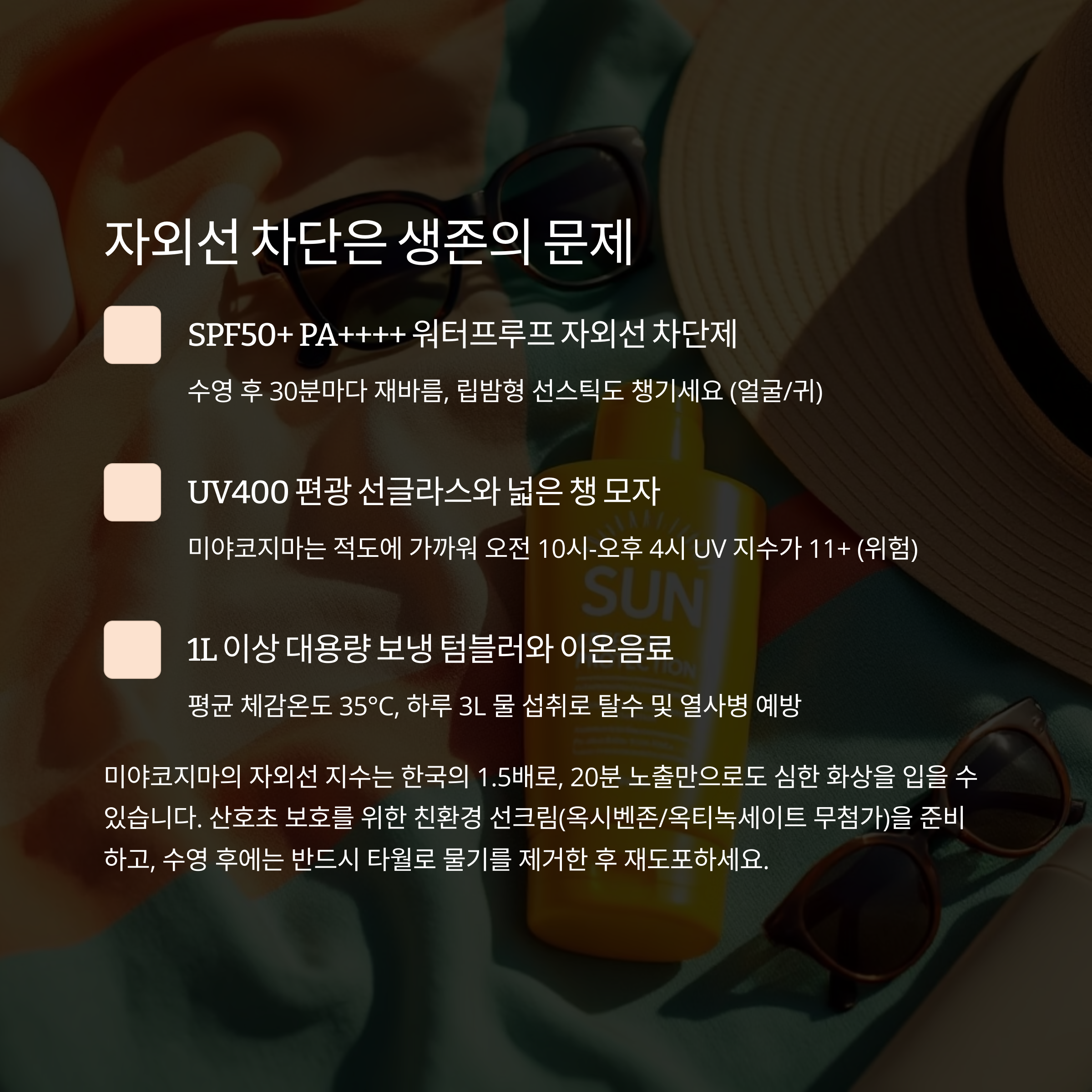 햇볕이 강한 미야코지마에서는 자외선 차단제가 필수입니다.