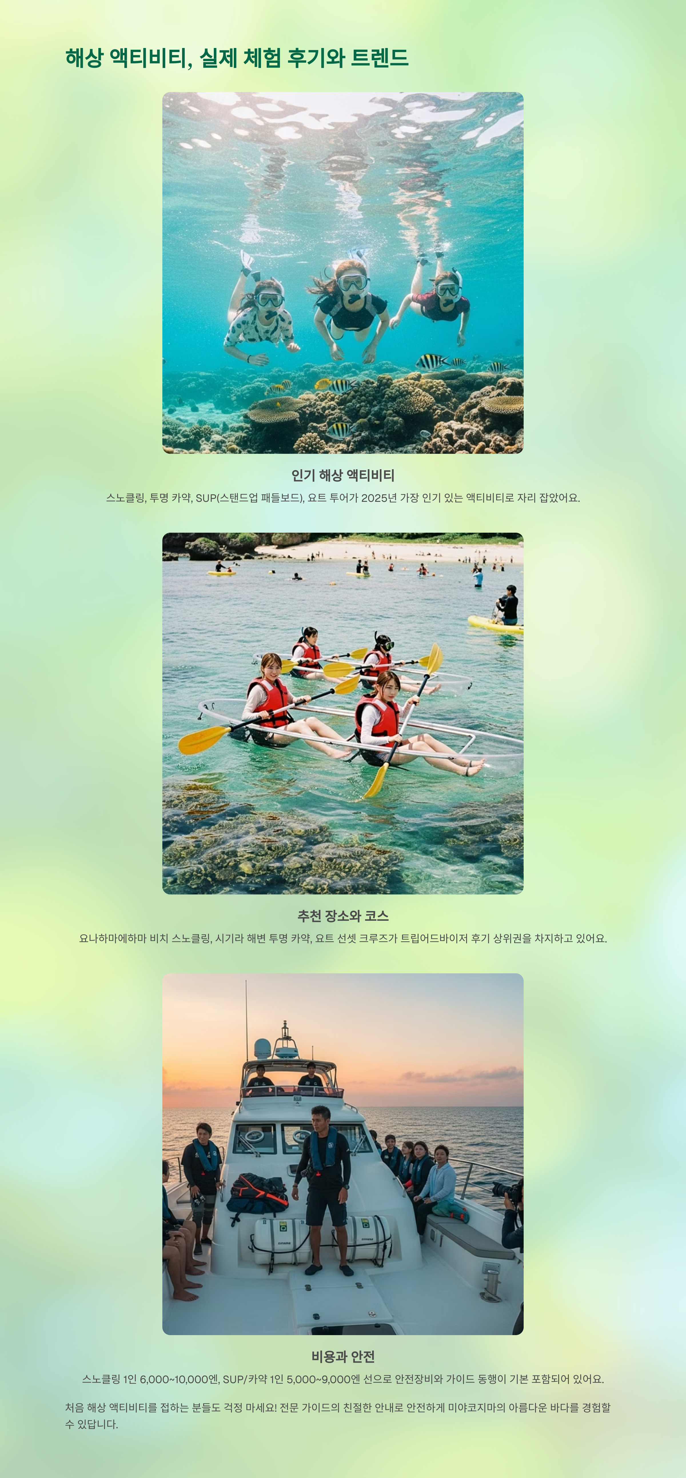"요나하마에하마 비치 스노클링" "시기라 해변 투명 카약"