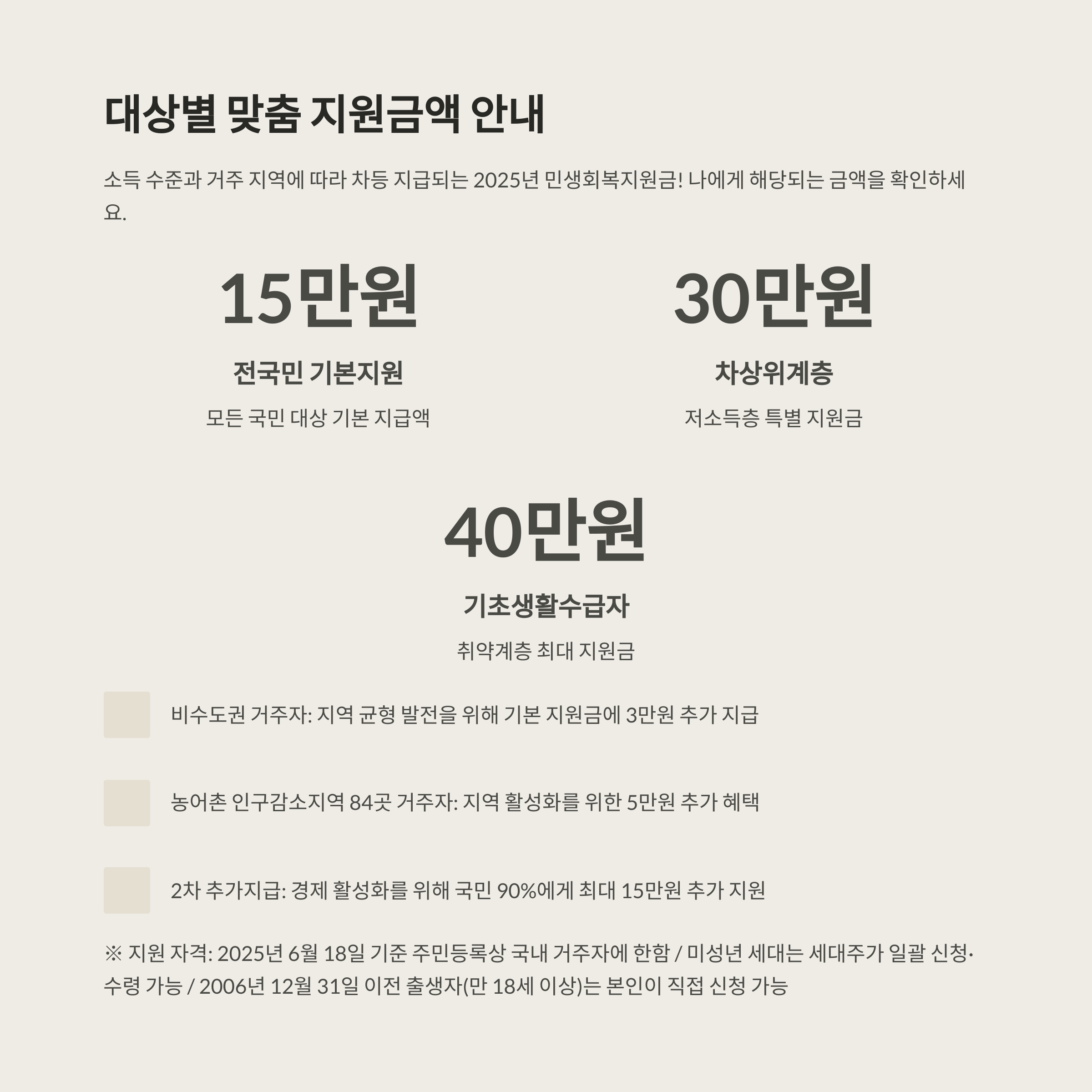 전국민 (1인 기준) | 15만 원 | 비수도권 +3만 원 | 최대 15만 원 추가 |