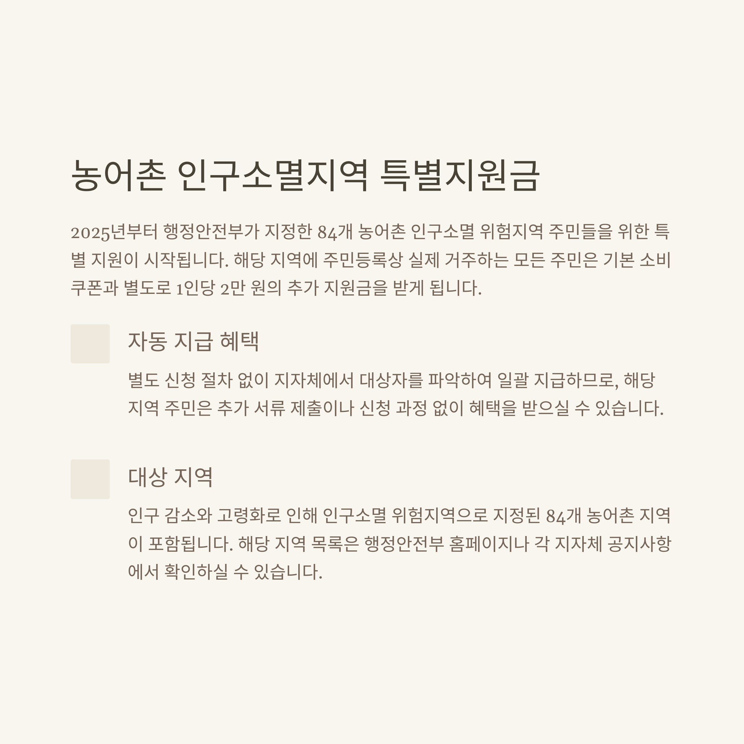 농어촌 인구소멸지역 특별지원금: 84개 지역 주민 2만 원씩 더 받아요