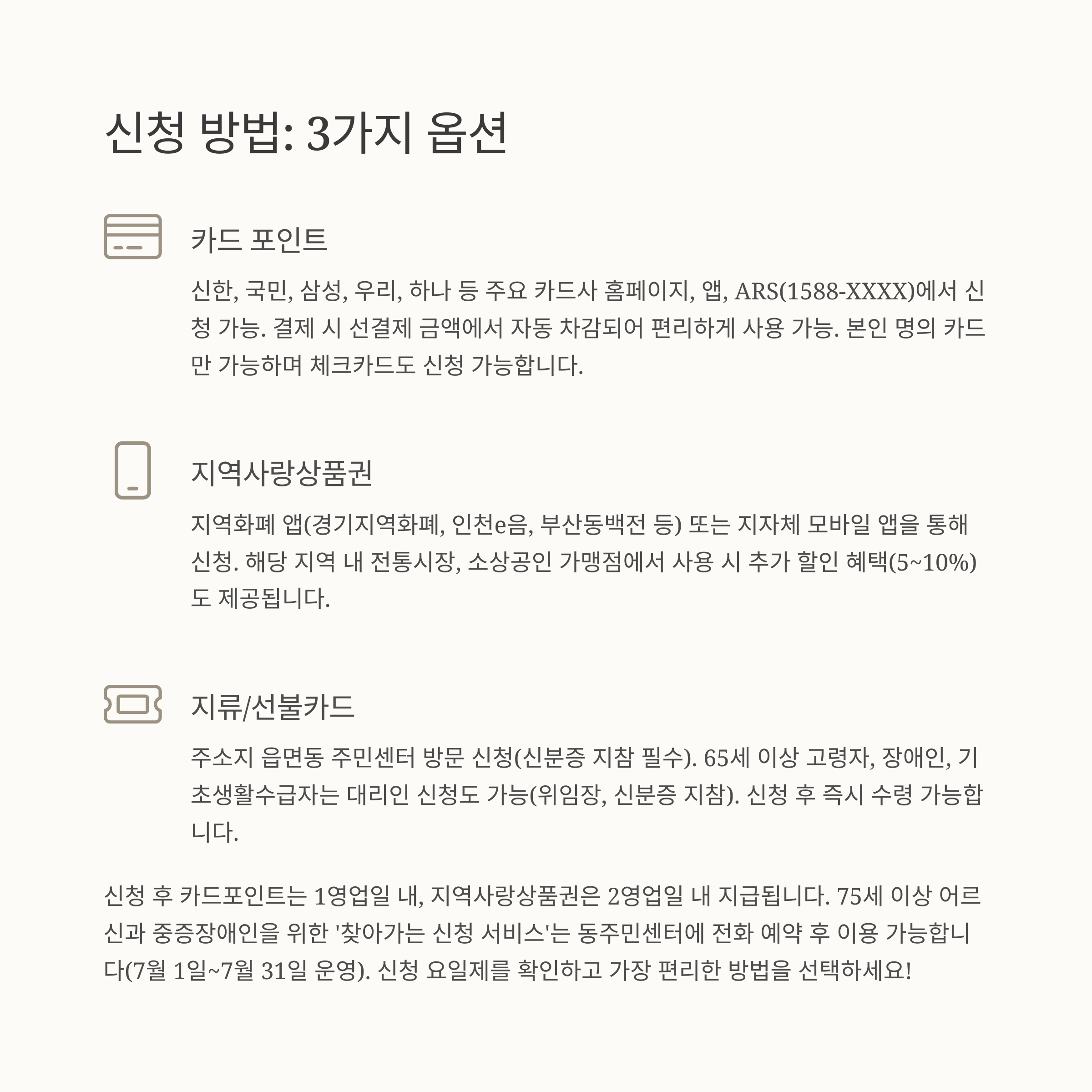 | 지급 방식 | 카드 포인트, 지역사랑상품권, 선불카드 중 선택 |