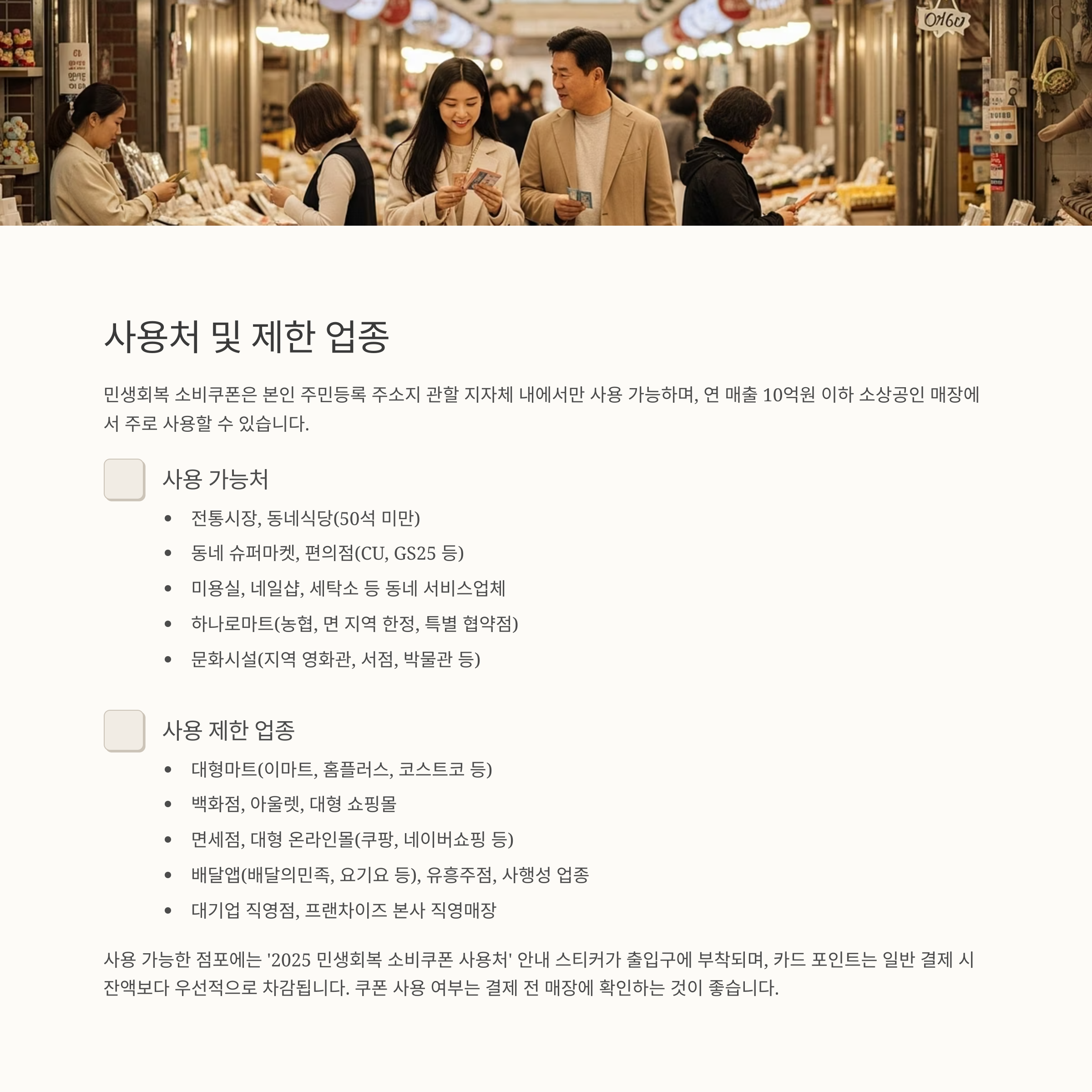 | 전통시장, 동네식당, 슈퍼, 편의점, 미용실 등 | 대형마트, 백화점, 면세점, 배달앱, 유흥업소, 온라인몰 등 |