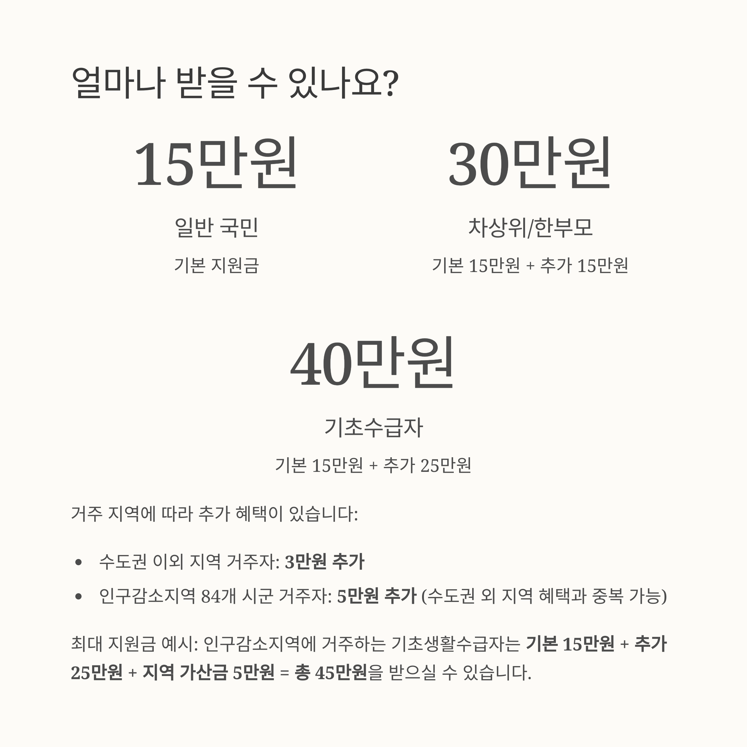 | 총 지급 한도 | 최대 45만 원 (기초수급자 + 인구감소지역 거주 시) |