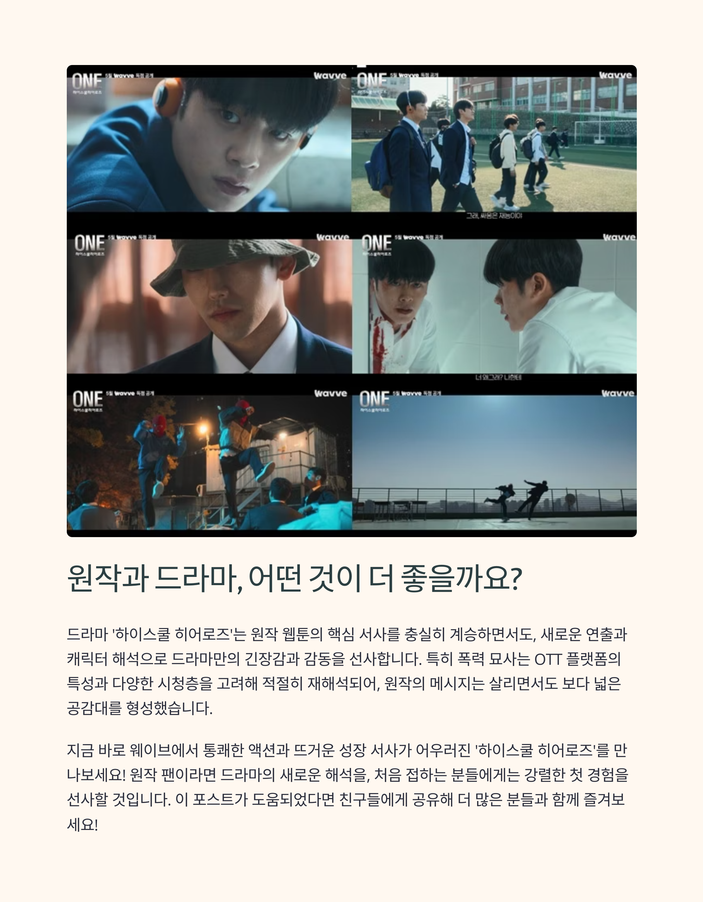 원작 팬과 새로운 시청자 모두를 사로잡을 수 있을지 귀추가 주목되며, 지금 바로 웨이브에서 통쾌한 액션과 뜨거운 성장 서사가 펼쳐지는 '하이스쿨 히어로즈'를 만나보세요!