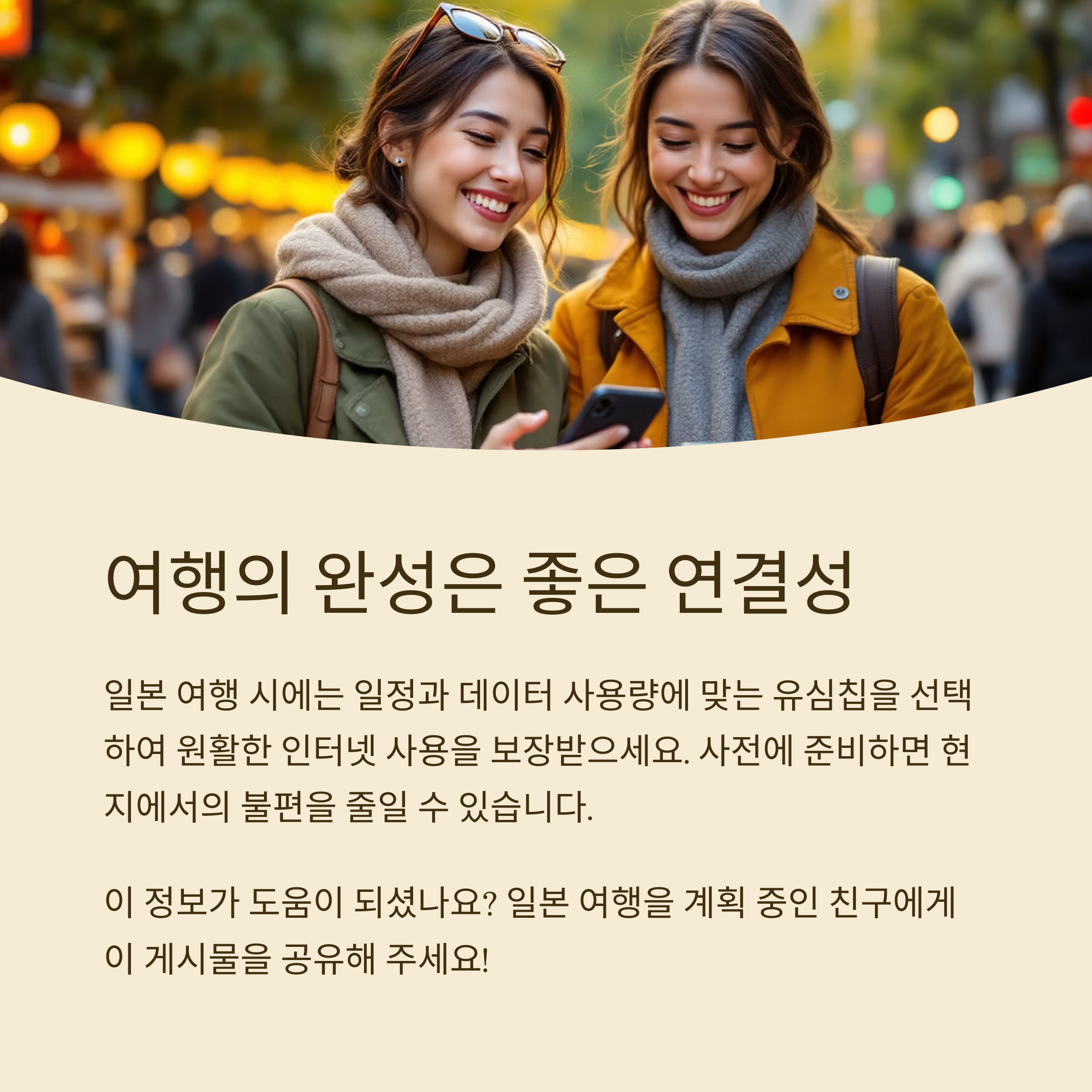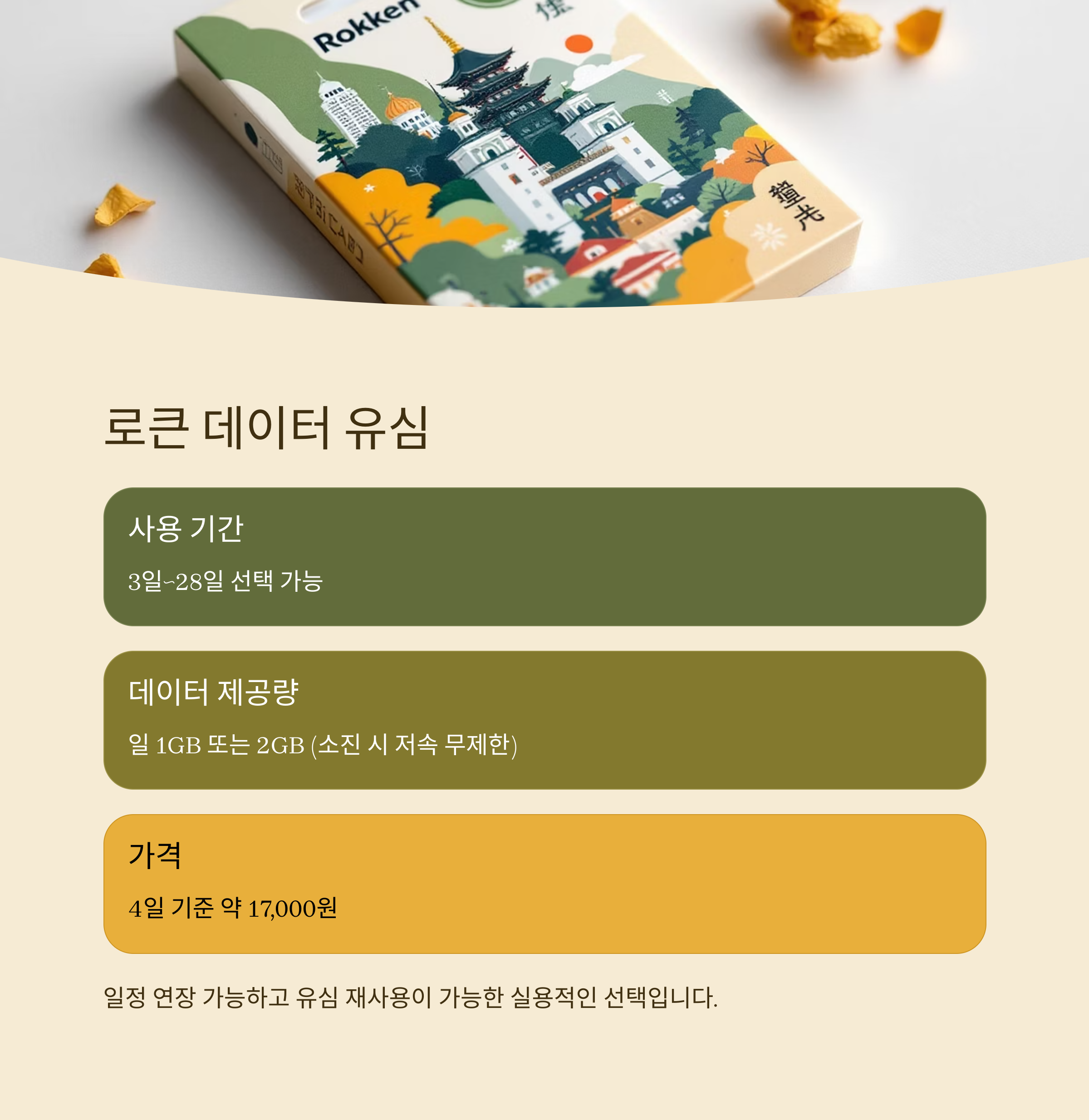 일본 여행 시에는 일정과 데이터 사용량에 맞는 유심칩을 선택하여 원활한 인터넷 사용을 보장받으세요. 사전에 준비하면 현지에서의 불편을 줄일 수 있습니다.