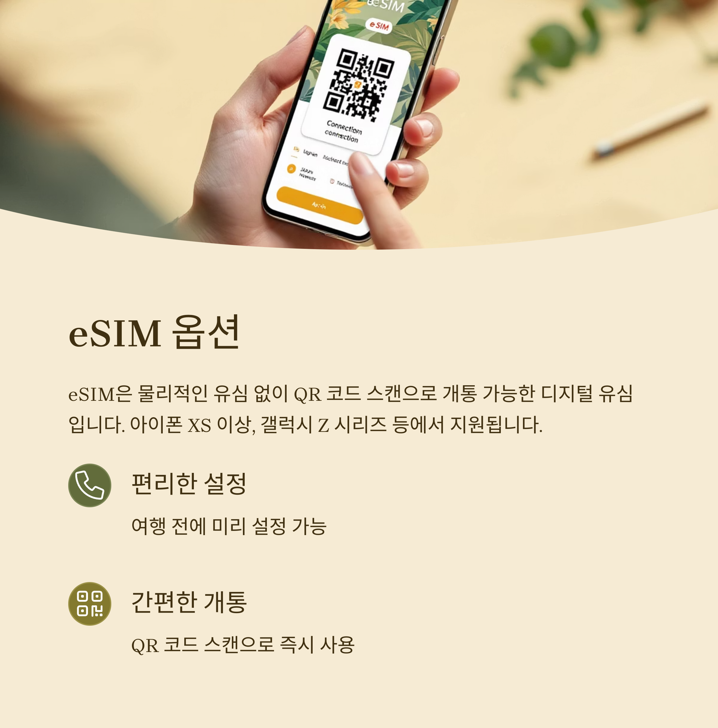eSIM은 물리적인 유심 없이 QR 코드 스캔으로 개통 가능한 디지털 유심입니다. 아이폰 XS 이상, 갤럭시 Z 시리즈 등에서 지원되며, 여행 전에 미리 설정하면 편리합니다.