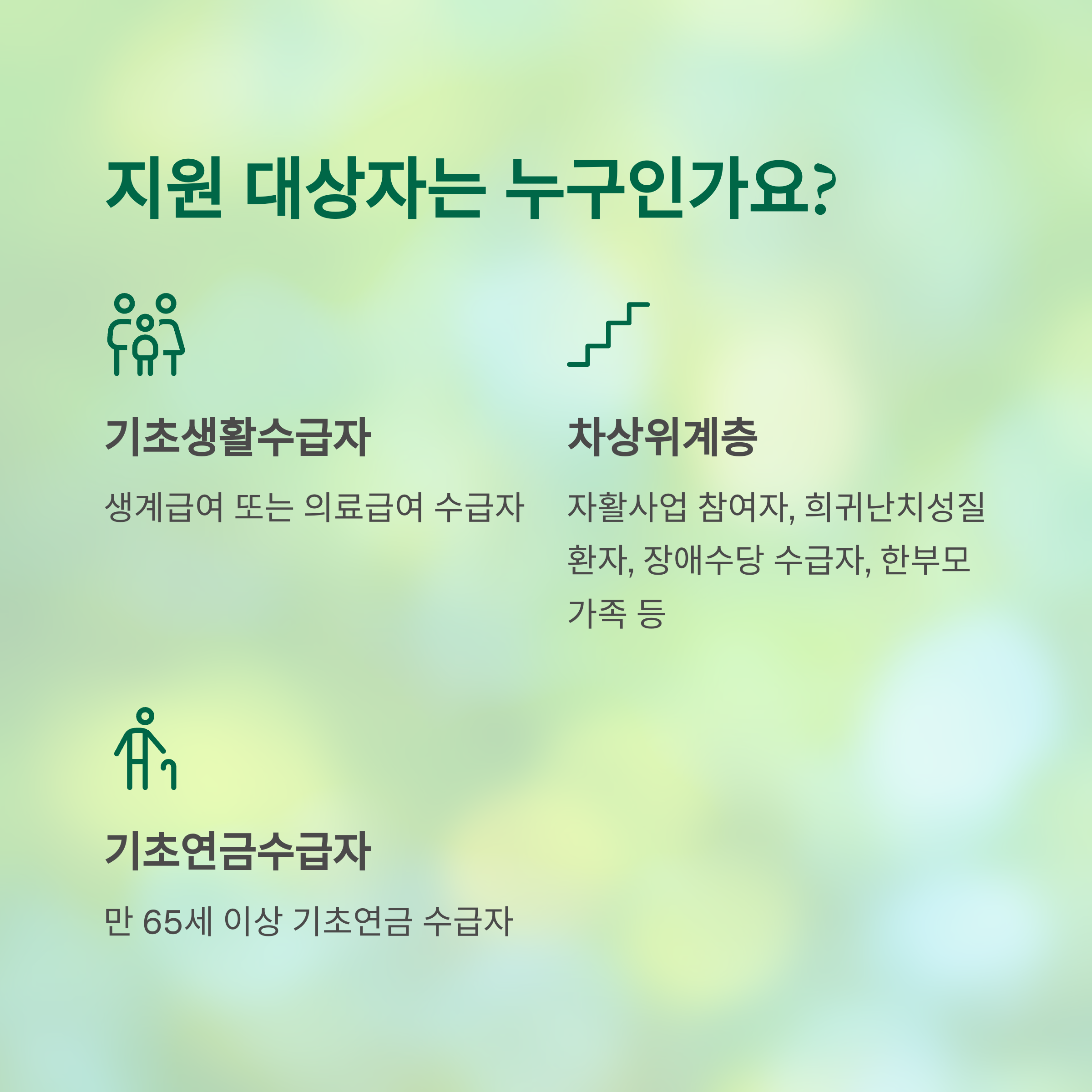 | 차상위계층 | 자활사업 참여자, 희귀난치성질환자, 장애수당 수급자, 한부모가족 등 |