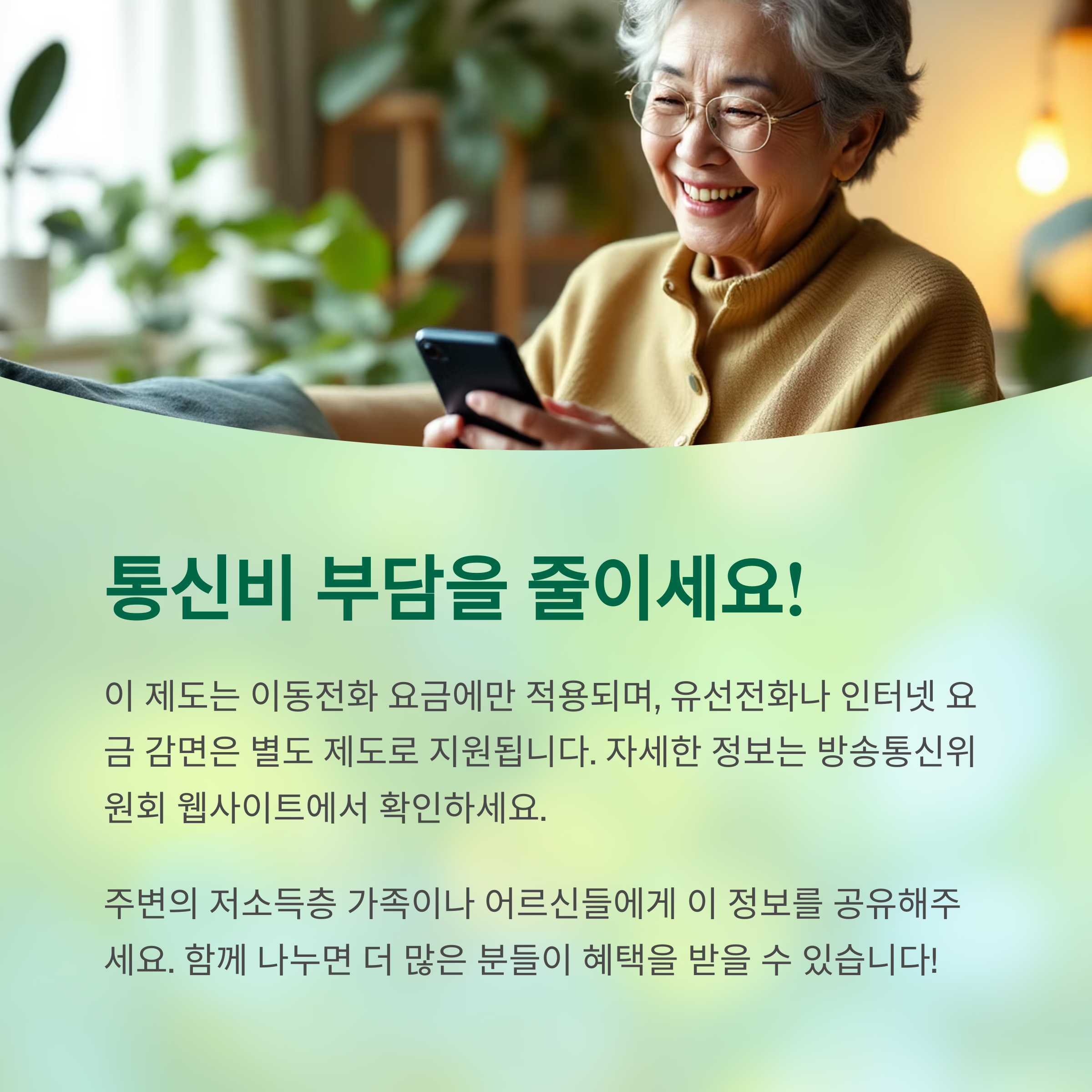 이 제도는 이동전화 요금에만 적용되며, 유선전화나 초고속 인터넷 요금 감면은 별도의 제도를 통해 지원됩니다.