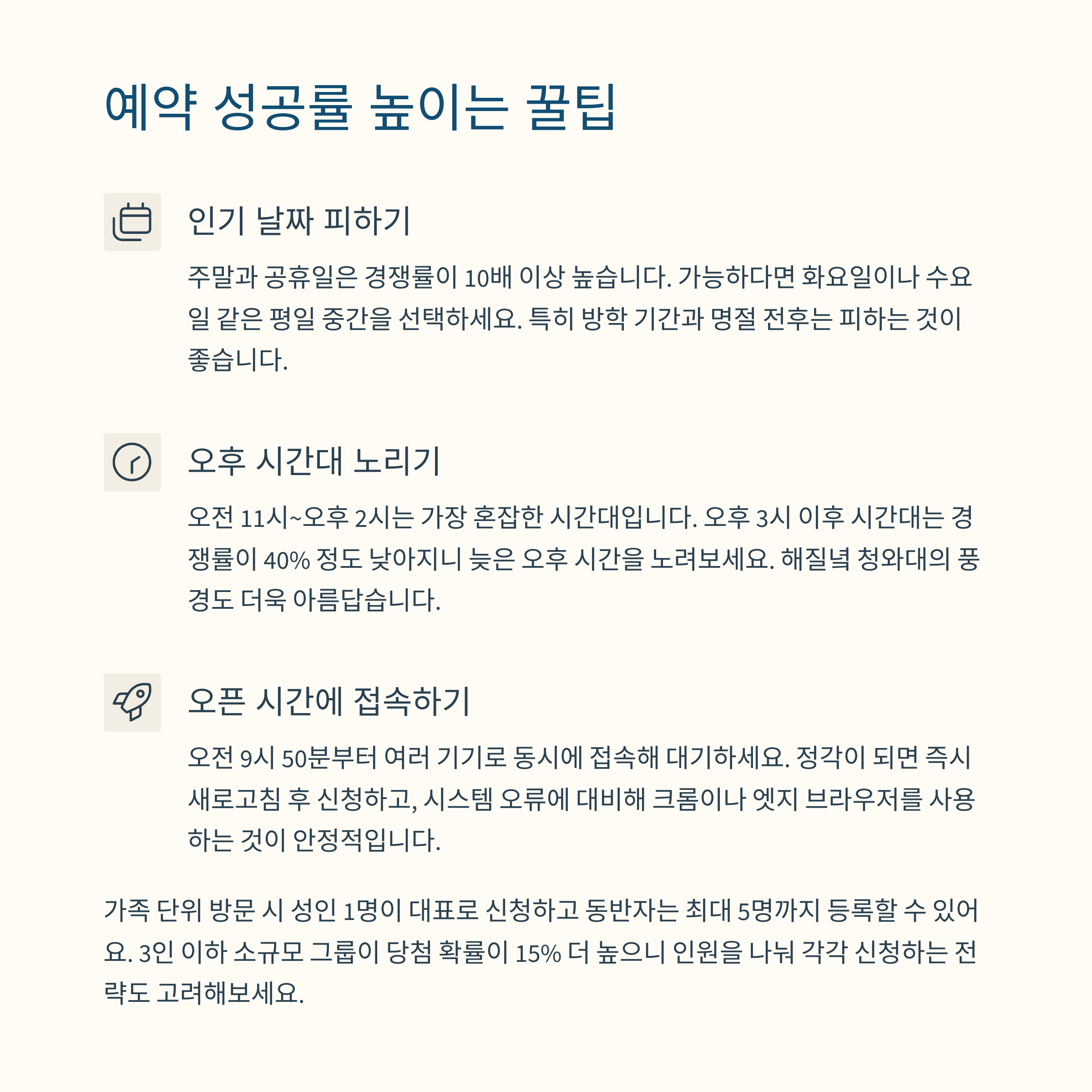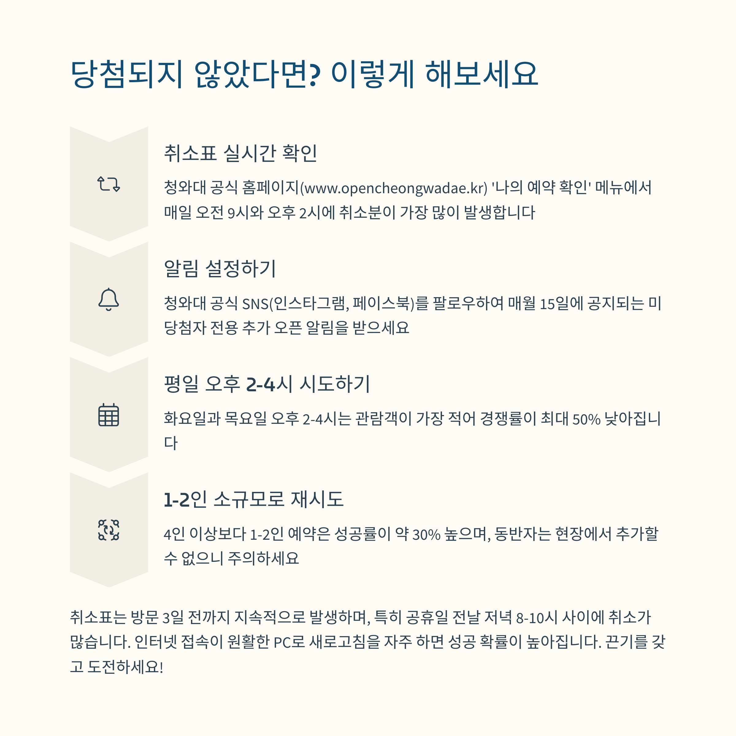 (홈페이지 ‘나의 예약 확인’ → 취소분 신청 가능) - 미당첨자 전용 추가 신청 오픈 안내를 알림 설정해두면