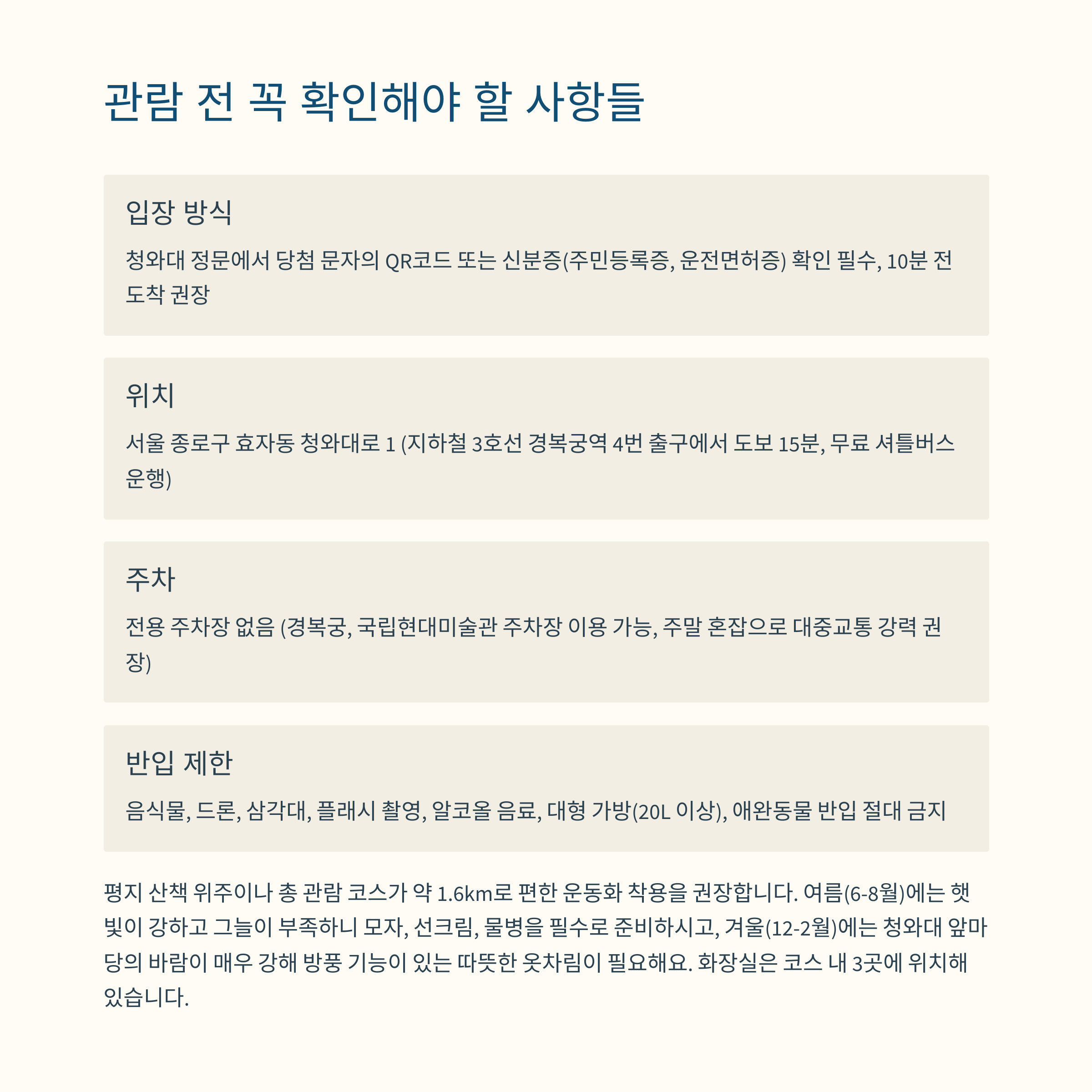 | 반입 제한 | 음식물, 드론, 삼각대, 플래시 촬영 금지 |