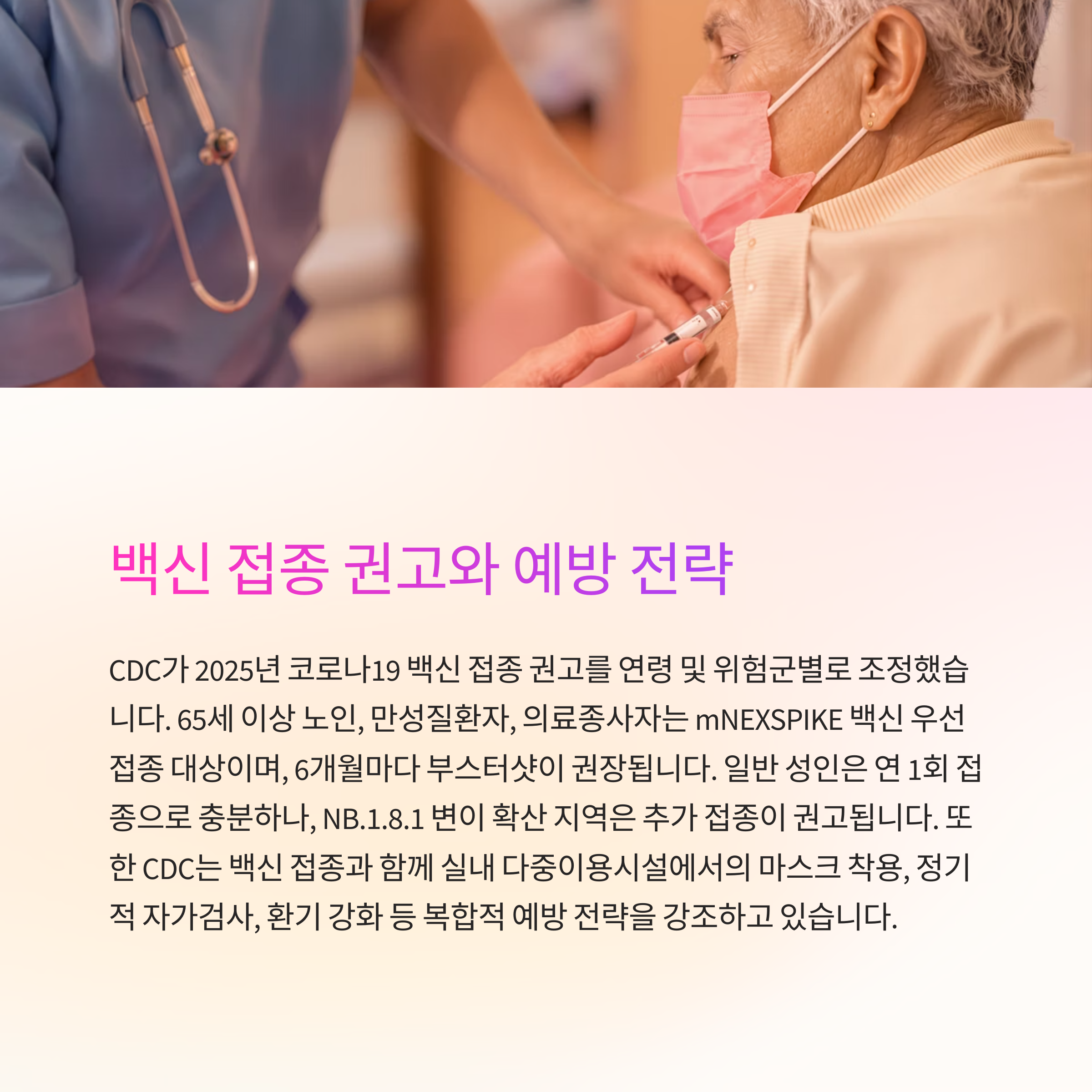 65세 이상 고령자와 기저질환자에게는 여전히 백신 접종을 강력히 권장하고 있으며,