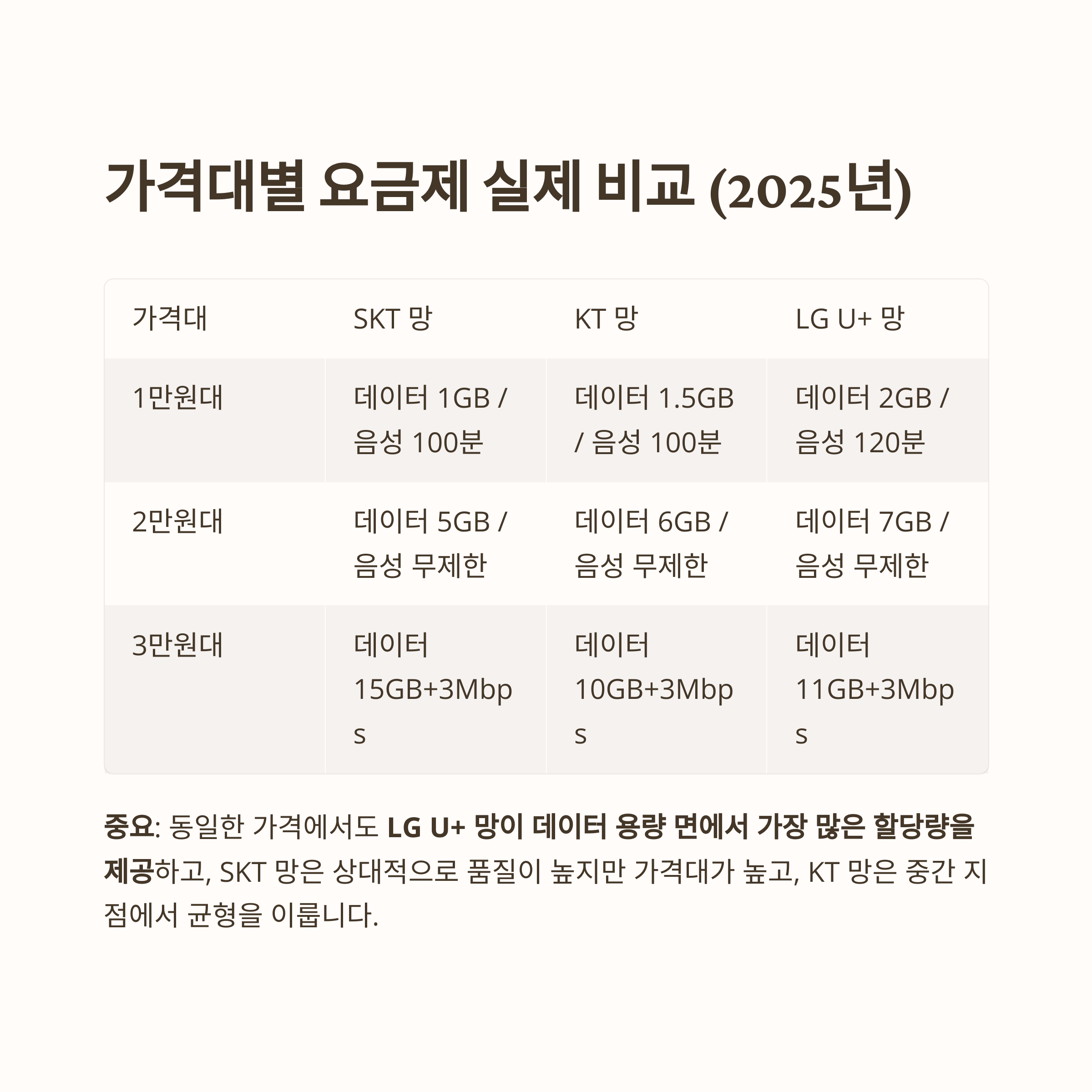중요: 동일한 가격에서도 LG U+ 망이 데이터 용량 면에서 가장 많은 할당량을 제공하고,