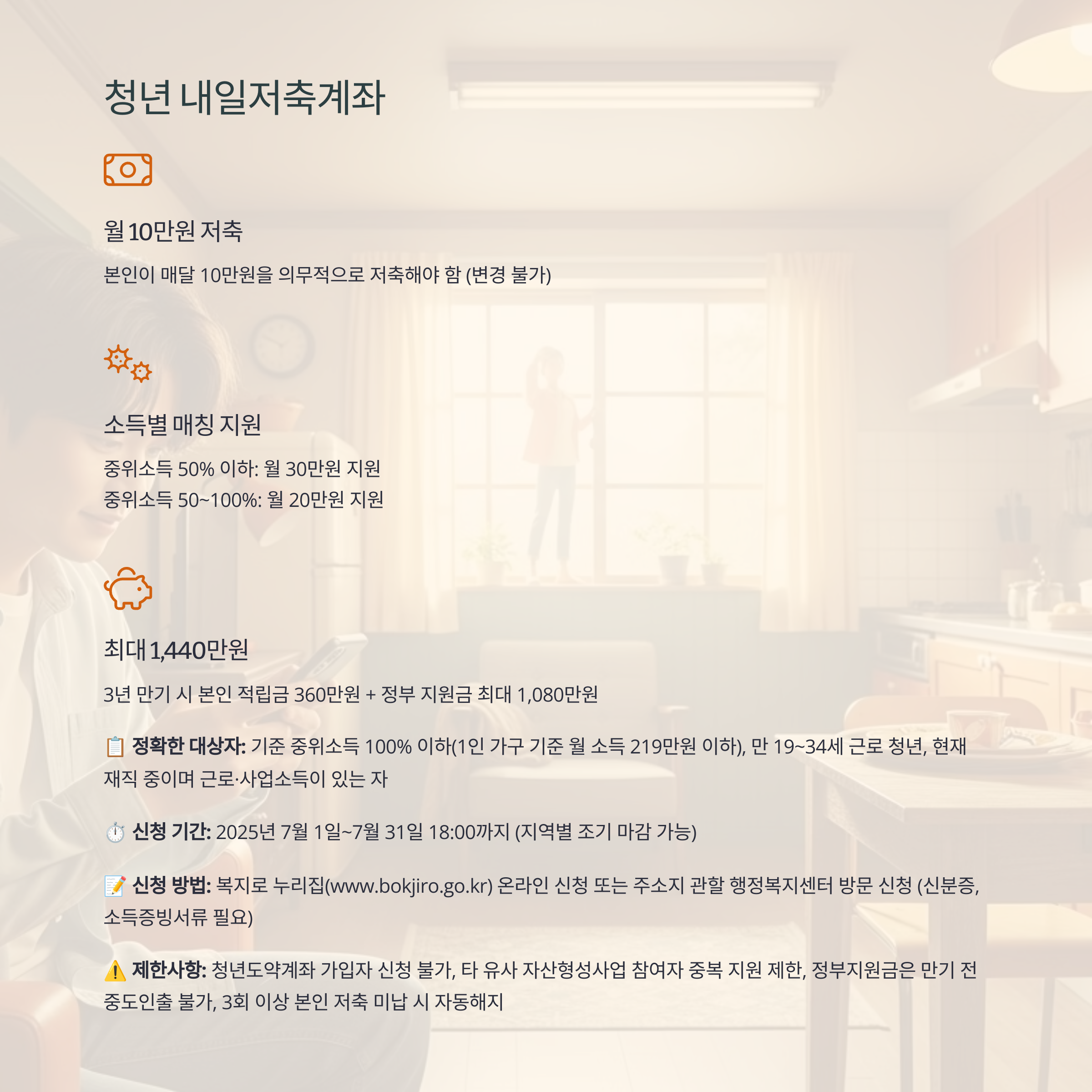 • 지원 내용: 개인 저축 월 최대 70만 원, 정부지원금 월 최대 40만 원까지 추가 적립