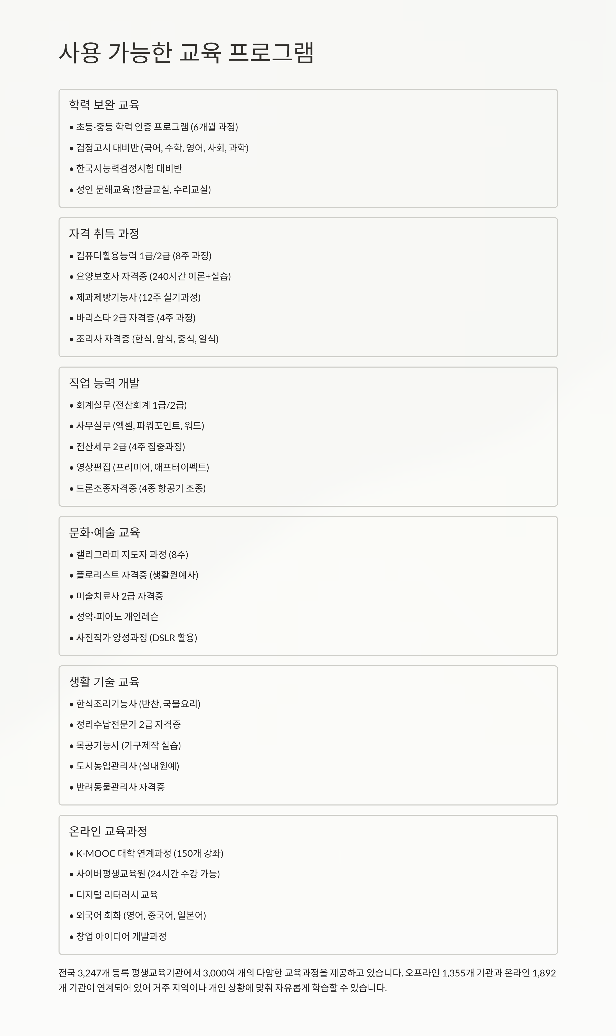 | 학력 보완 | 초등·중등 학력 인증, 검정고시 대비 |