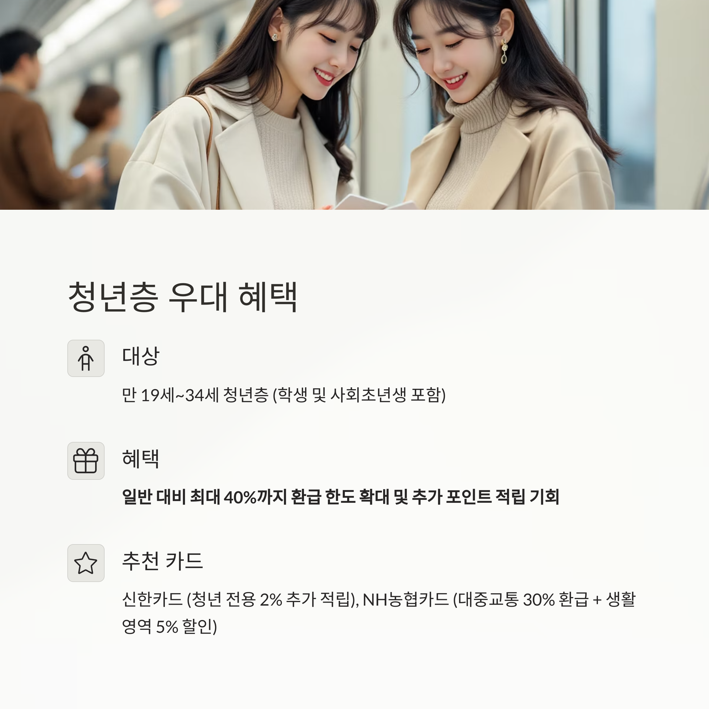 | 교통 + 편의점 결합 할인 | 대중교통과 일상소비가 모두 포함된 통합형 카드 활용 |