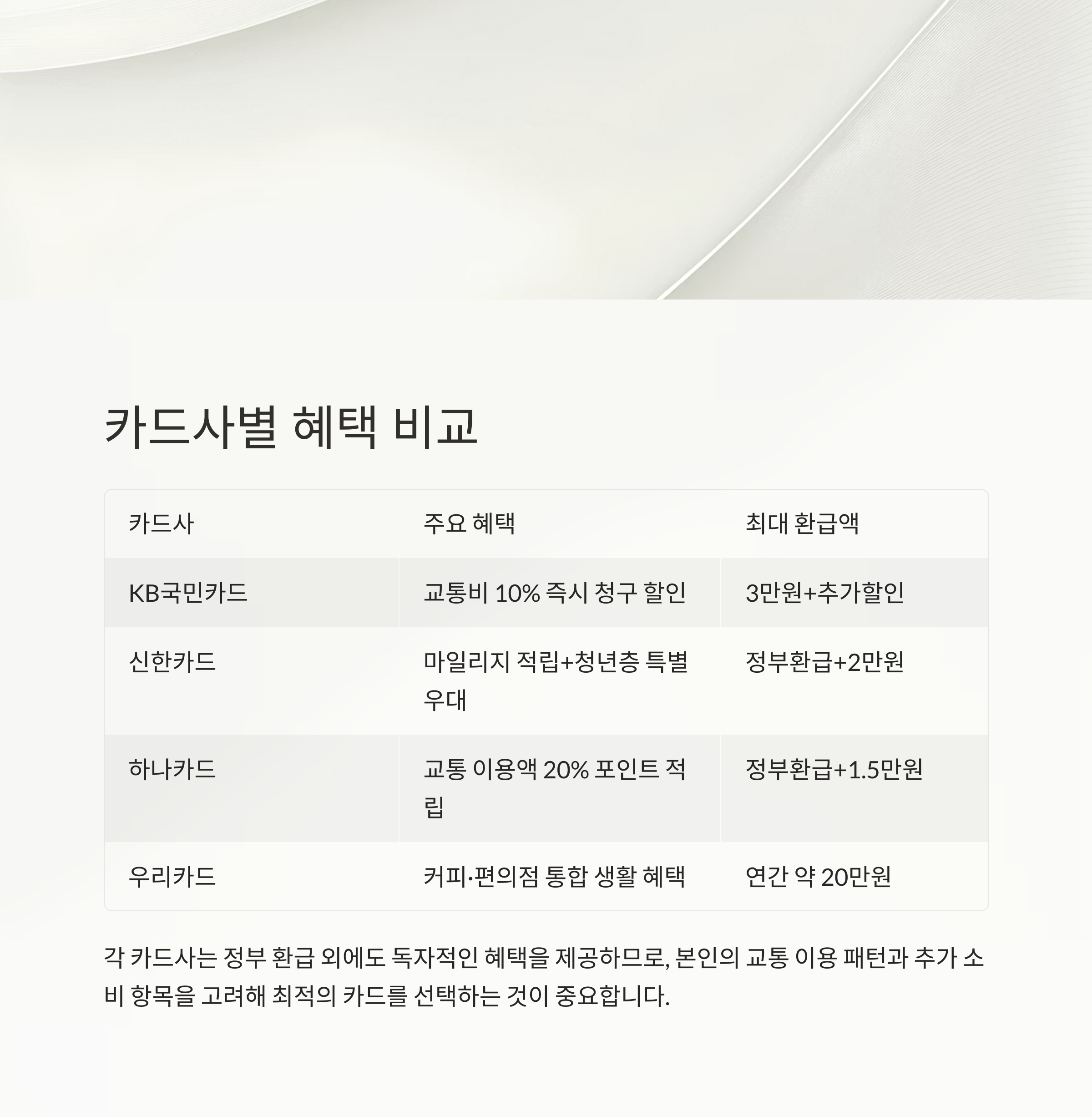 | 하나카드 | 청구 할인 + 대중교통 이용금액 20% 적립 | 정부 환급 + 월 최대 1.5만 원 절감 |