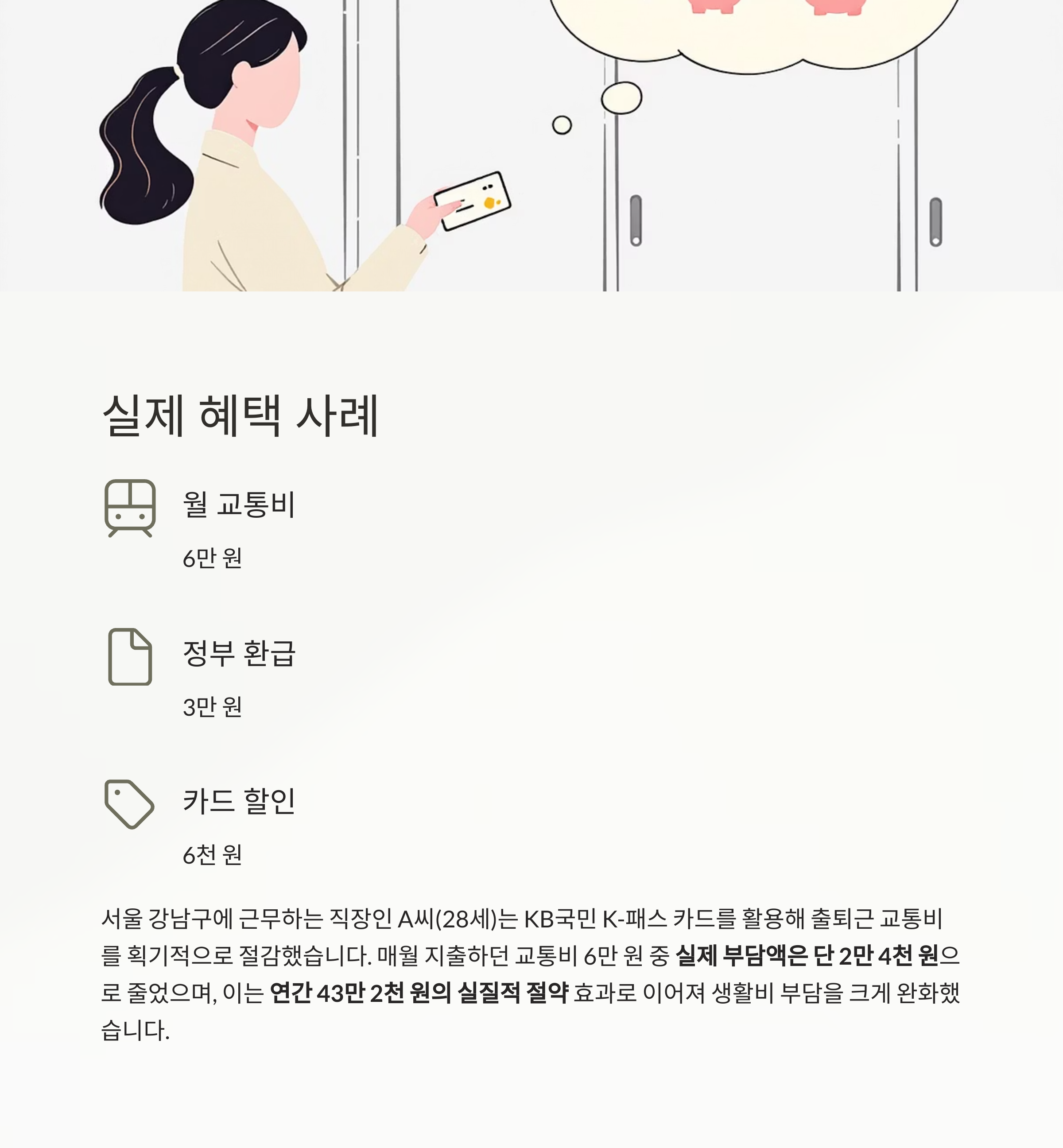 | KB국민카드 | 교통비 10% 청구 할인 + K-패스 적용 | 정부 환급 3만 원 + 추가 할인 |