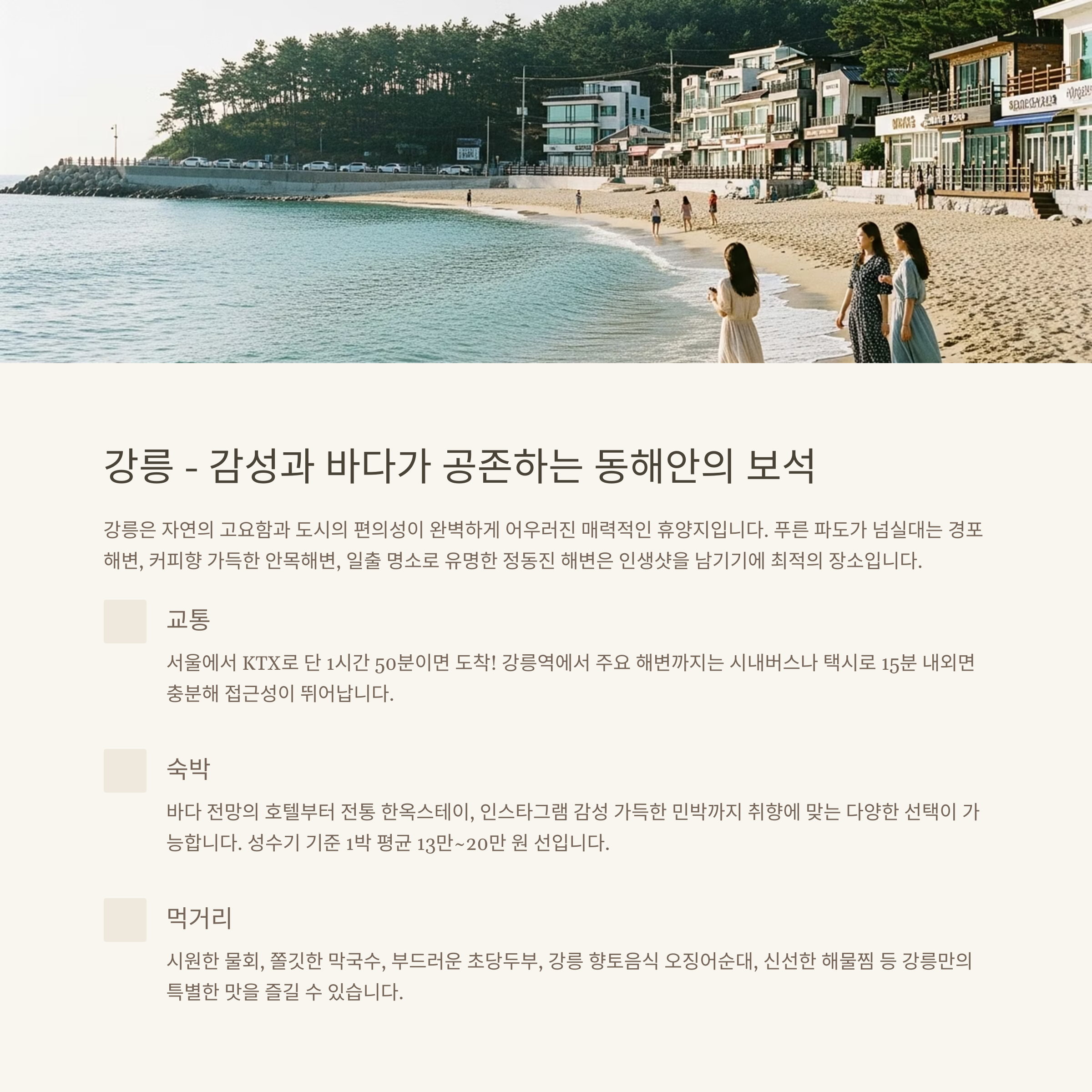 강릉은 자연의 고요함과 도시의 편의성을 동시에 가진 곳입니다.