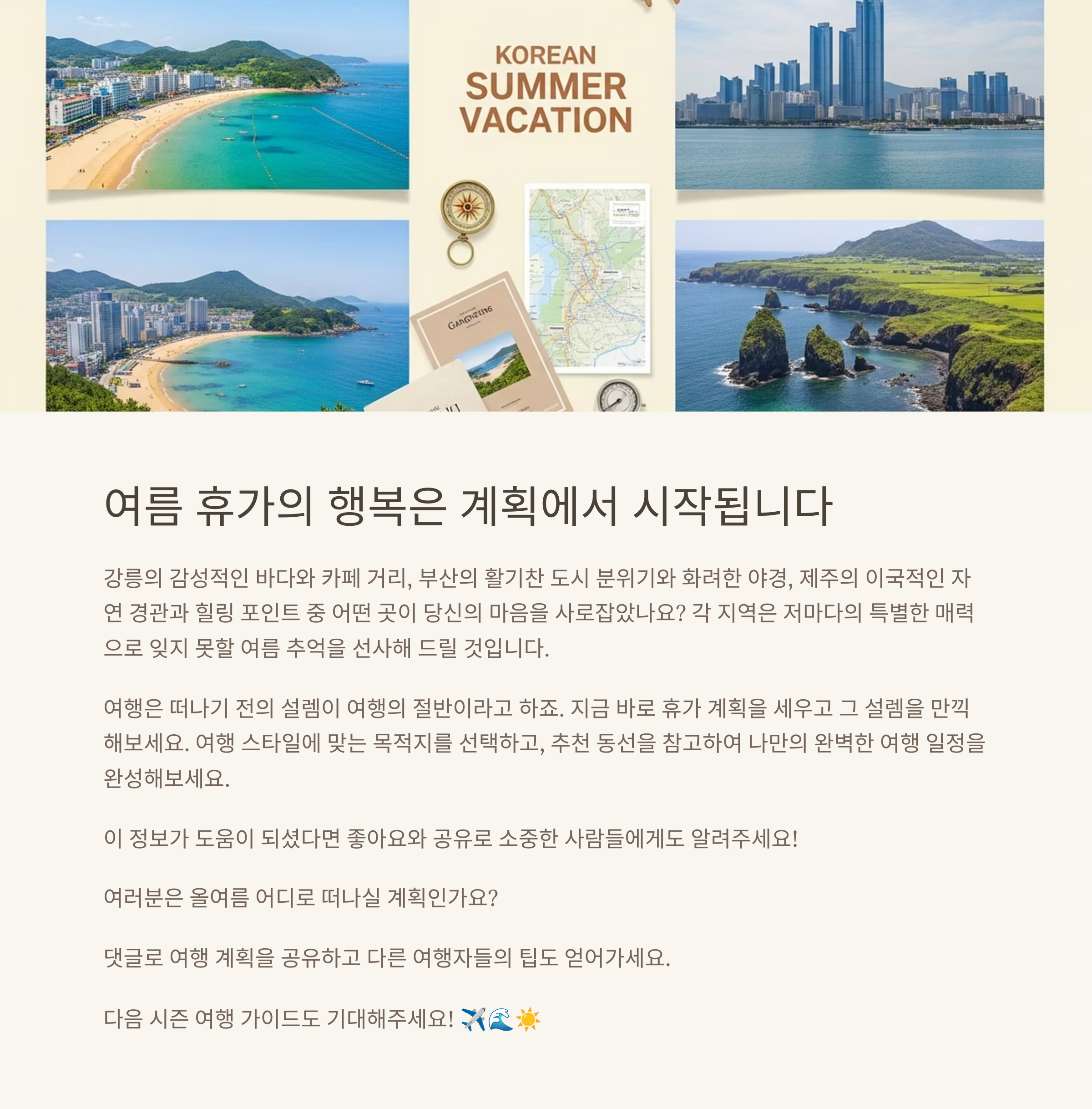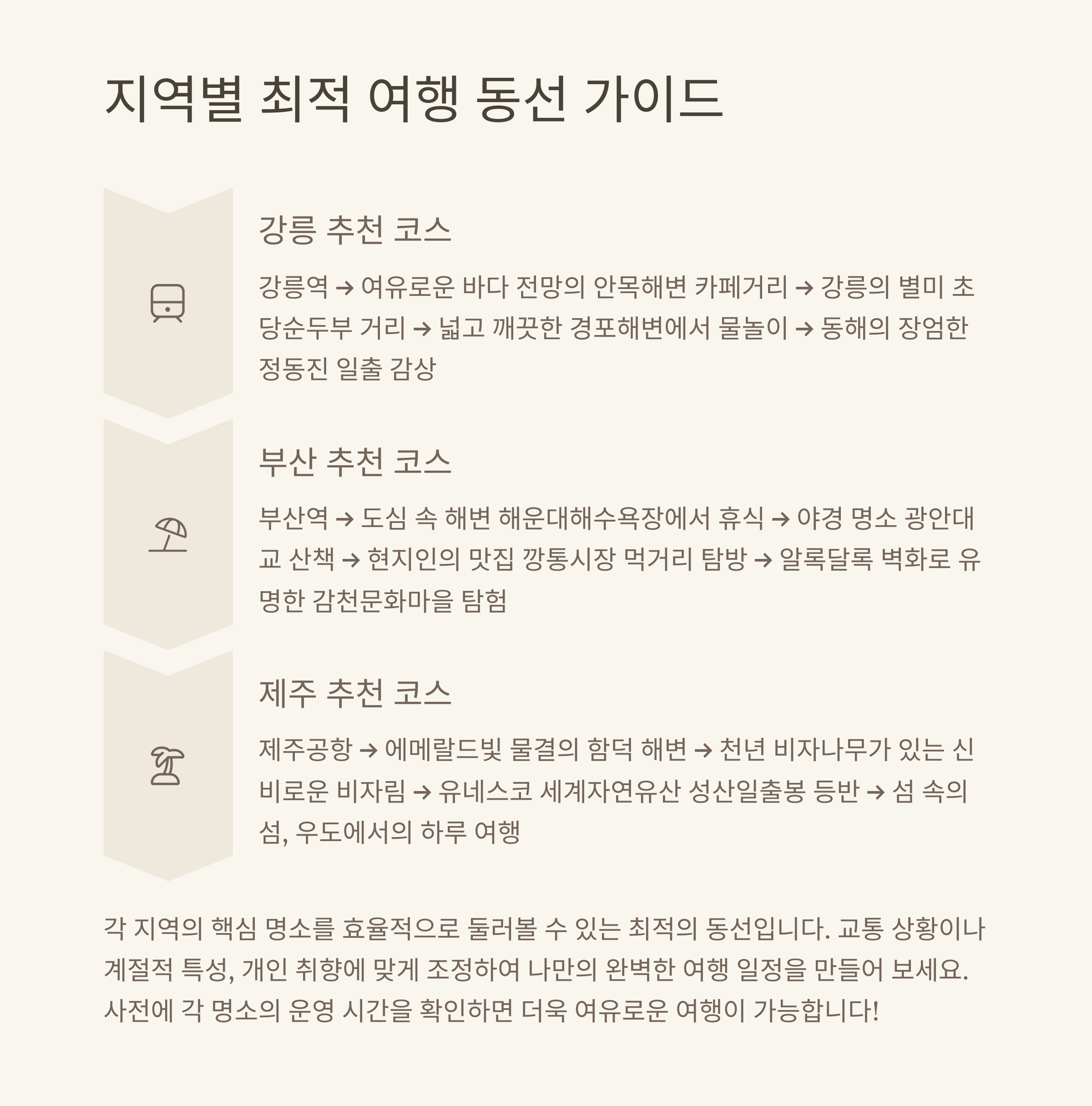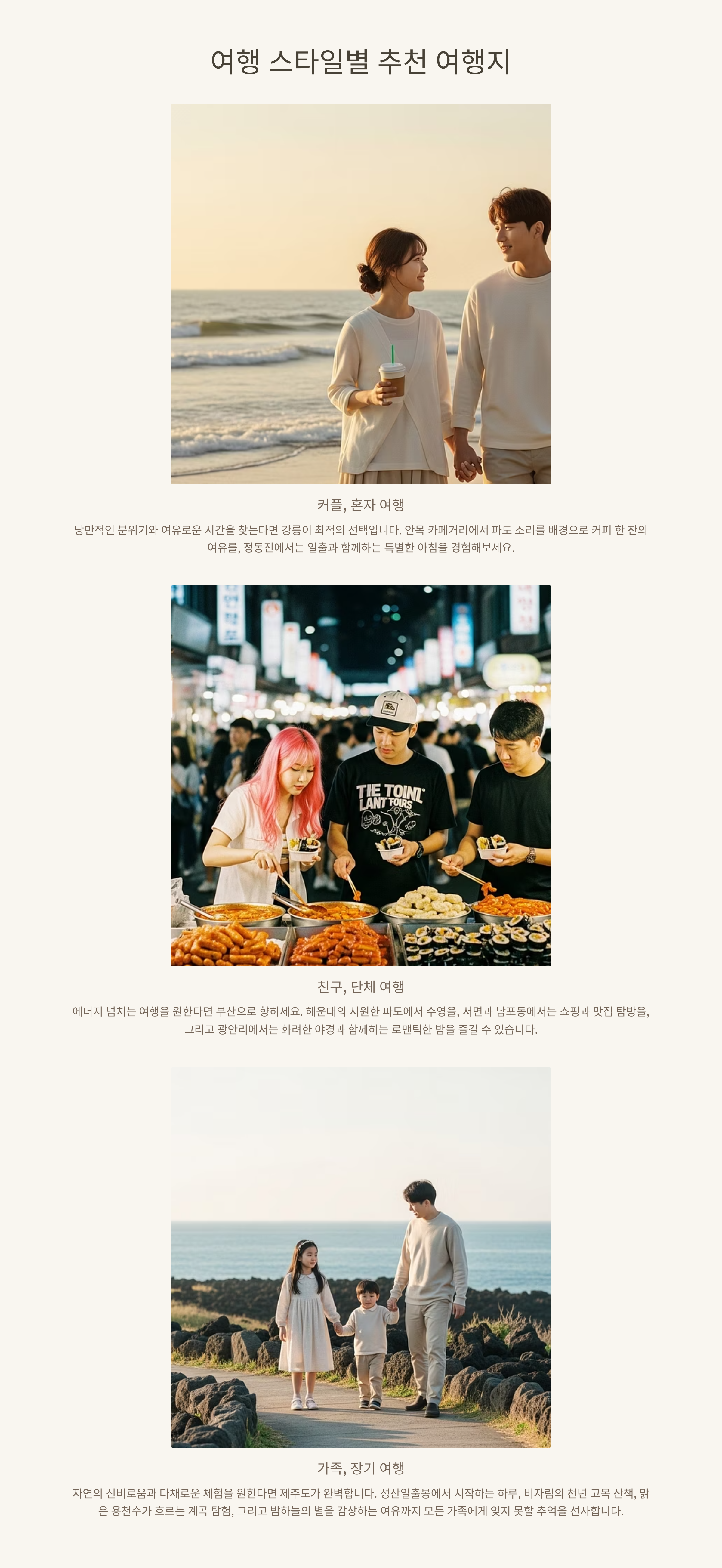 | 분위기 | 조용하고 감성적 | 활기차고 도심적 | 이국적이고 자연 중심 |