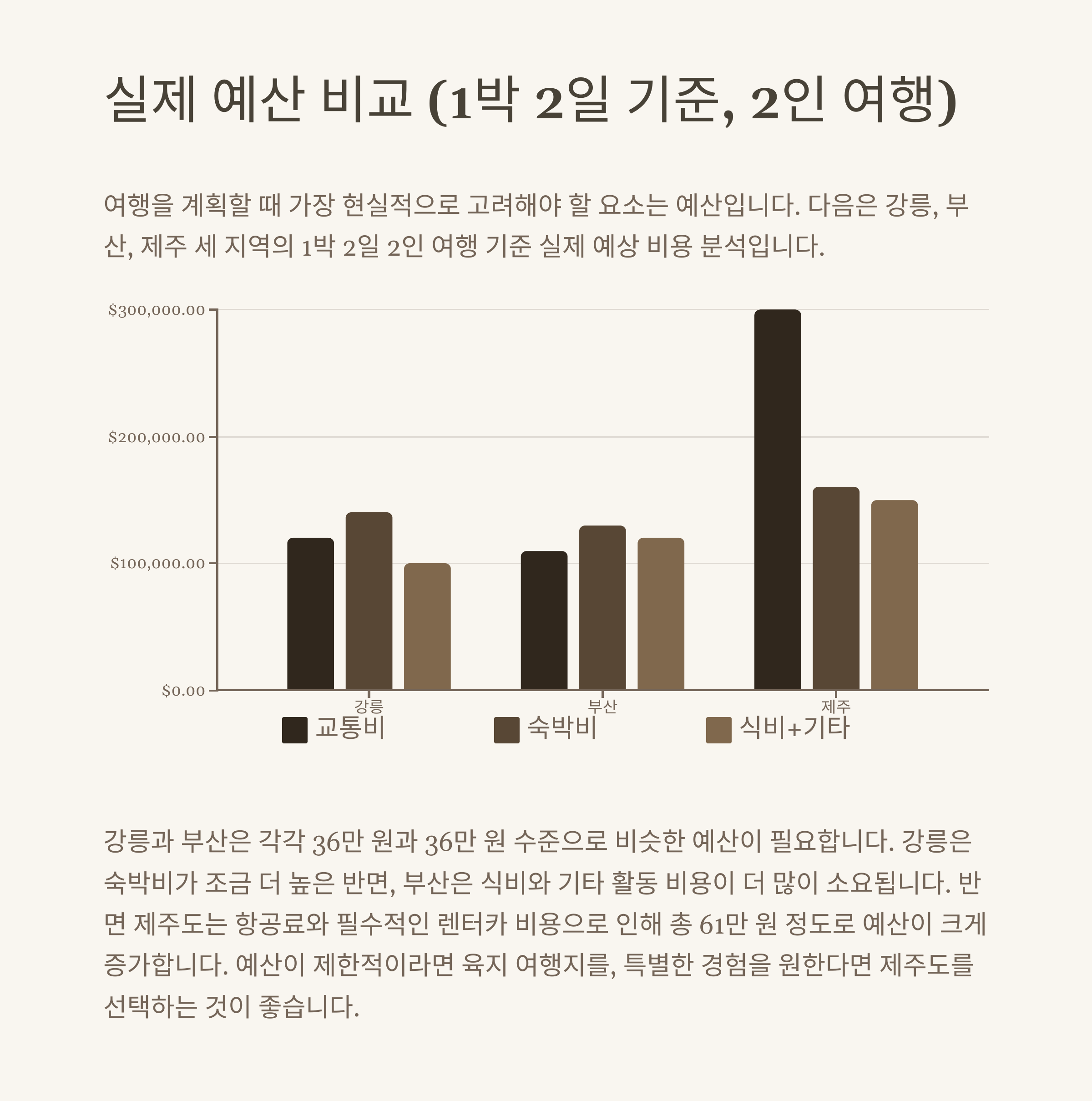 | 강릉 | 약 12만 원 (KTX) | 14만 원 | 8만 원 | 2만 원 | 약 36만 원 |