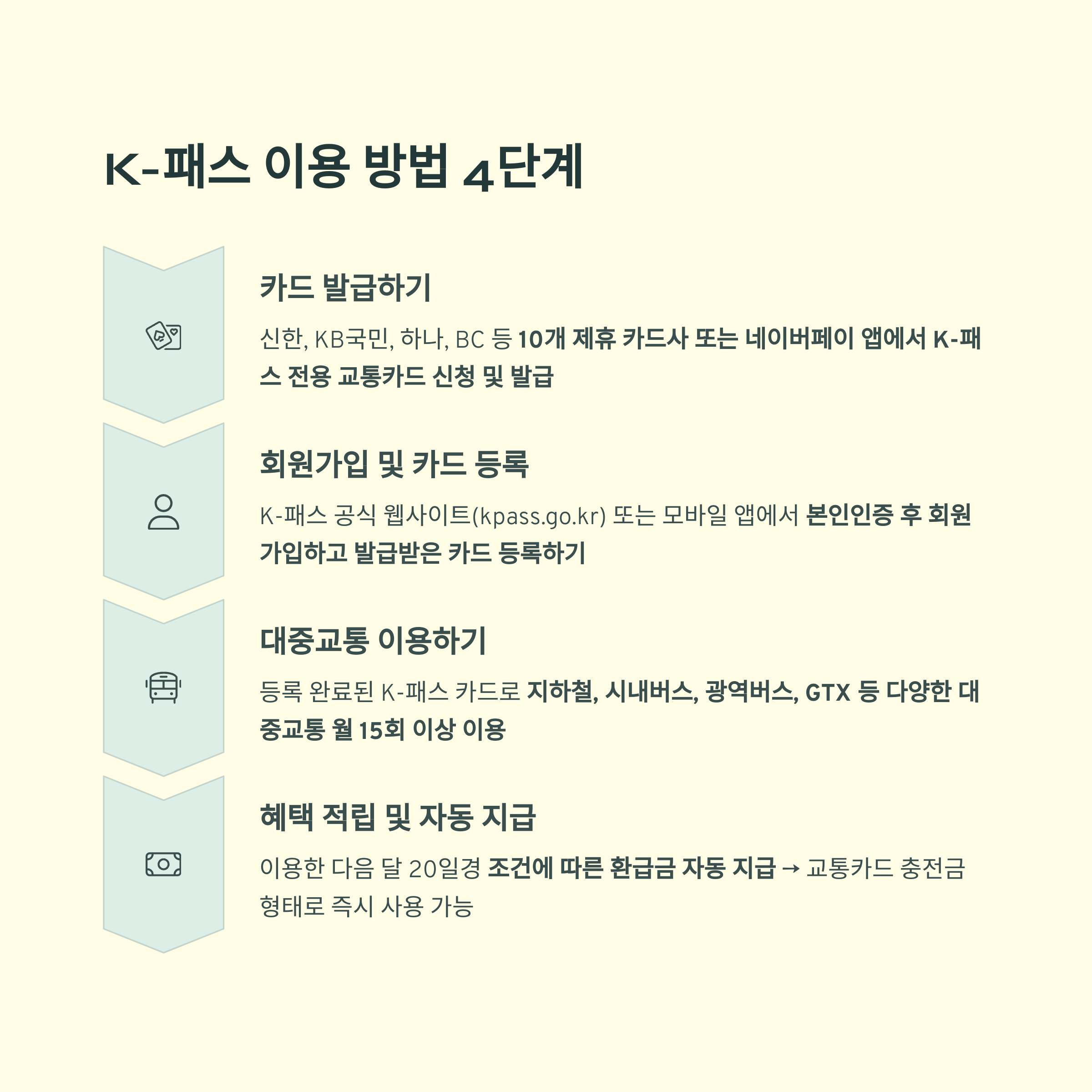 K-패스는 대중교통을 자주 이용하는 시민에게 매월 교통비 일부를 현금처럼 환급해 주는 제도입니다.