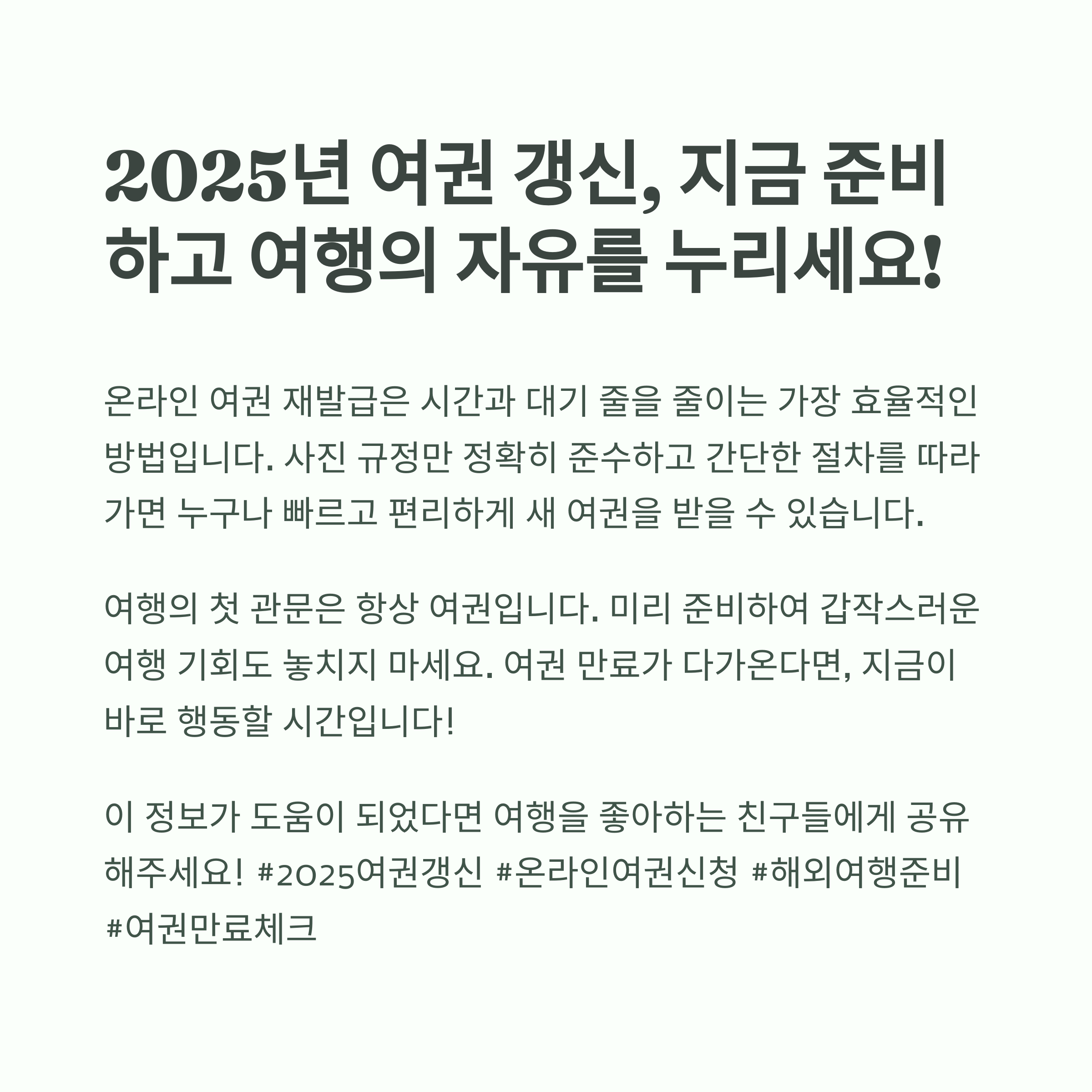 2025년에도 해외여행 수요가 꾸준히 증가하면서 여권 갱신 수요 역시 급증하고 있습니다.
