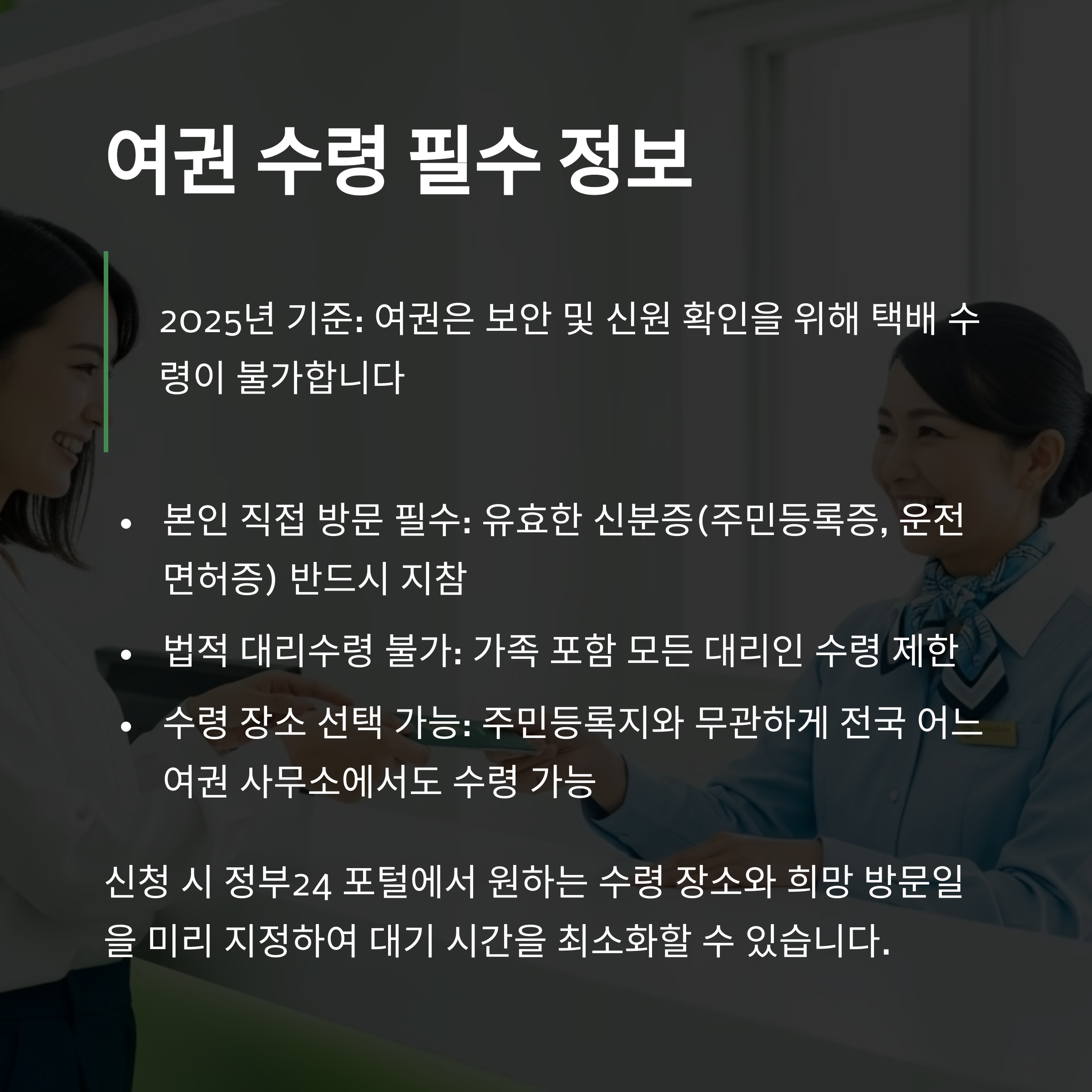 현재(2025년 기준) 여권은 보안성 문제로 택배 수령이 불가능하며