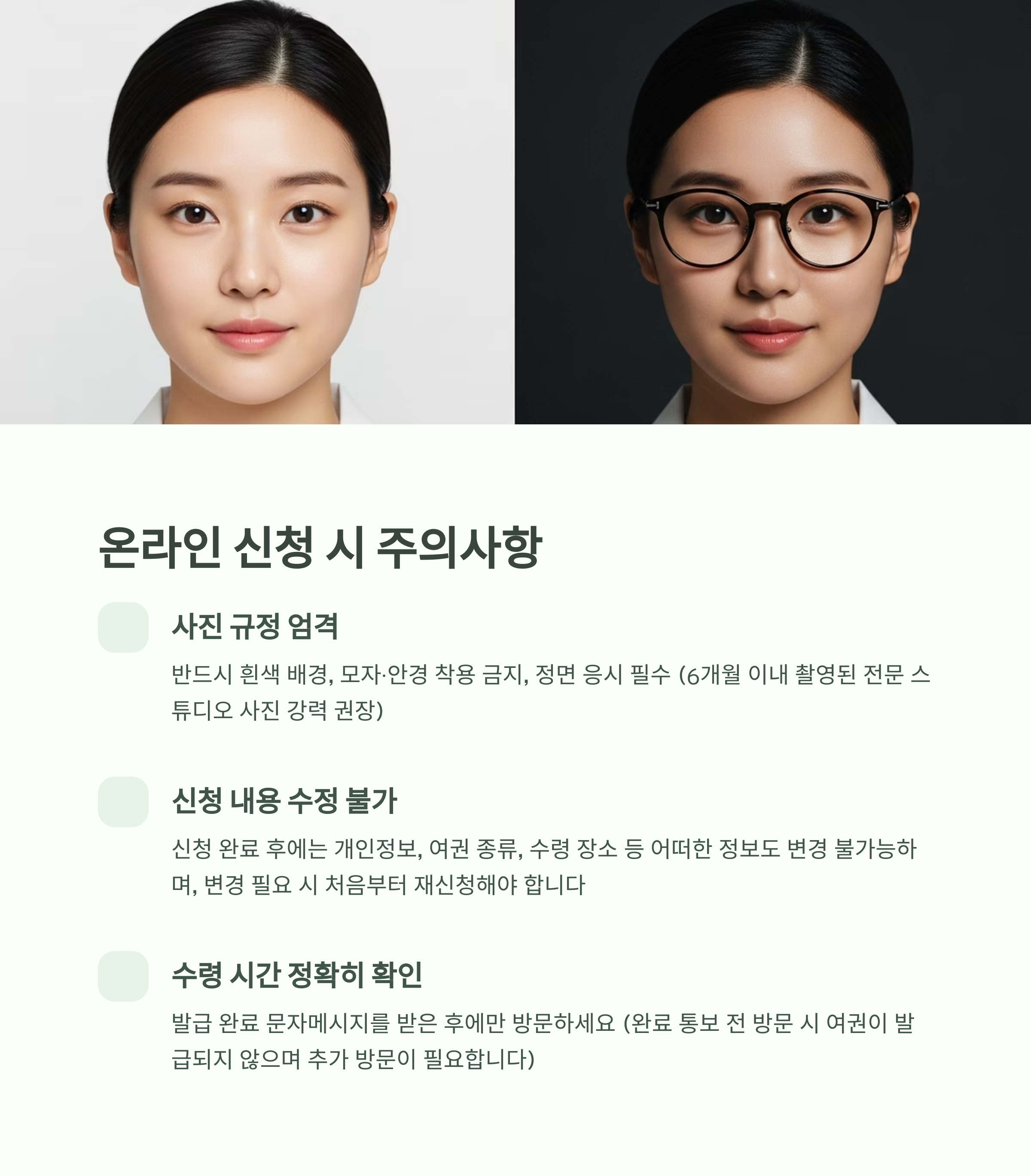 - 여권 사진 규정이 매우 까다로움: 스마트폰 셀카 업로드로 거절되는 경우 많음