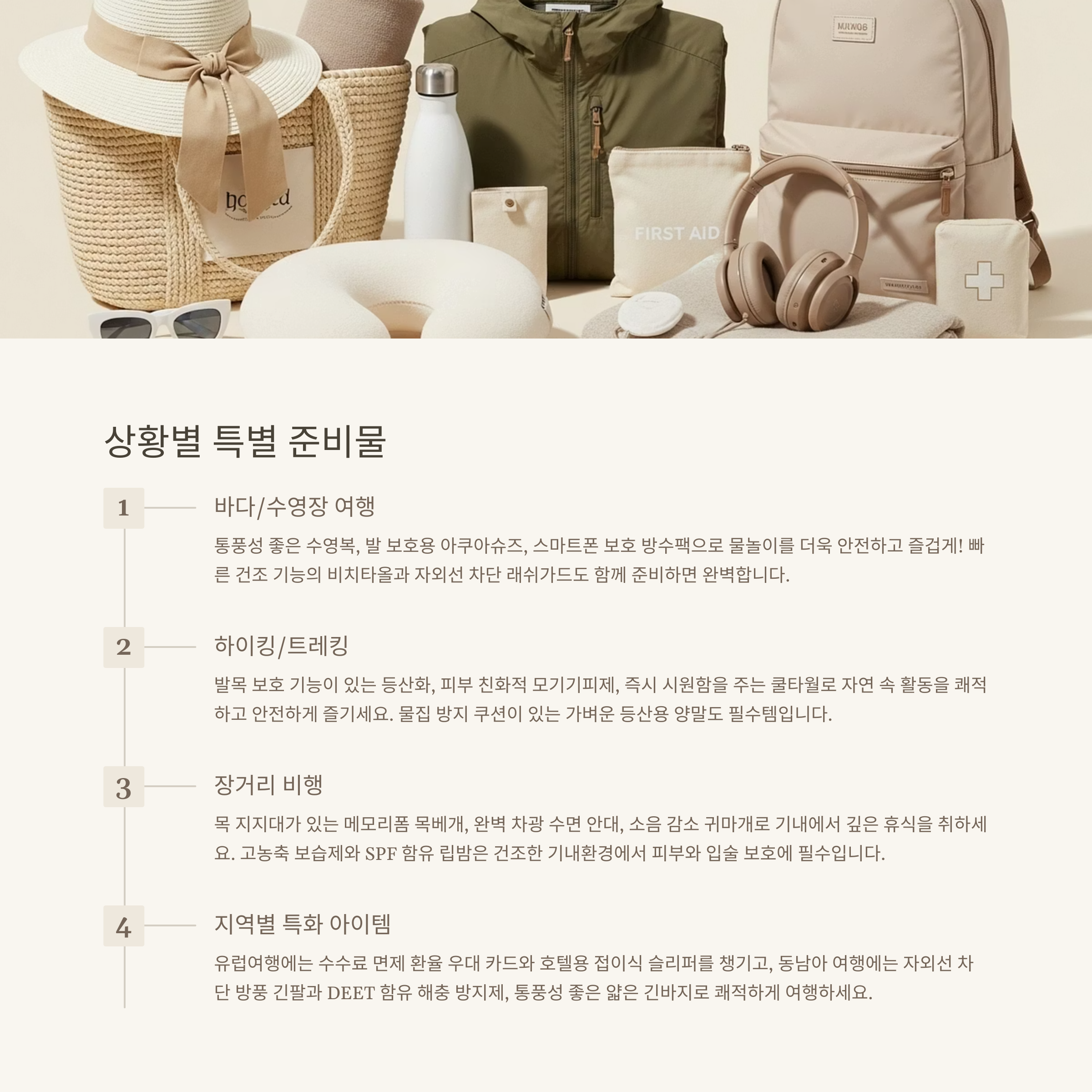 ✔ 여행국가 날씨, 문화, 활동에 따라 준비물을 커스터마이징하는 것이 핵심이에요.