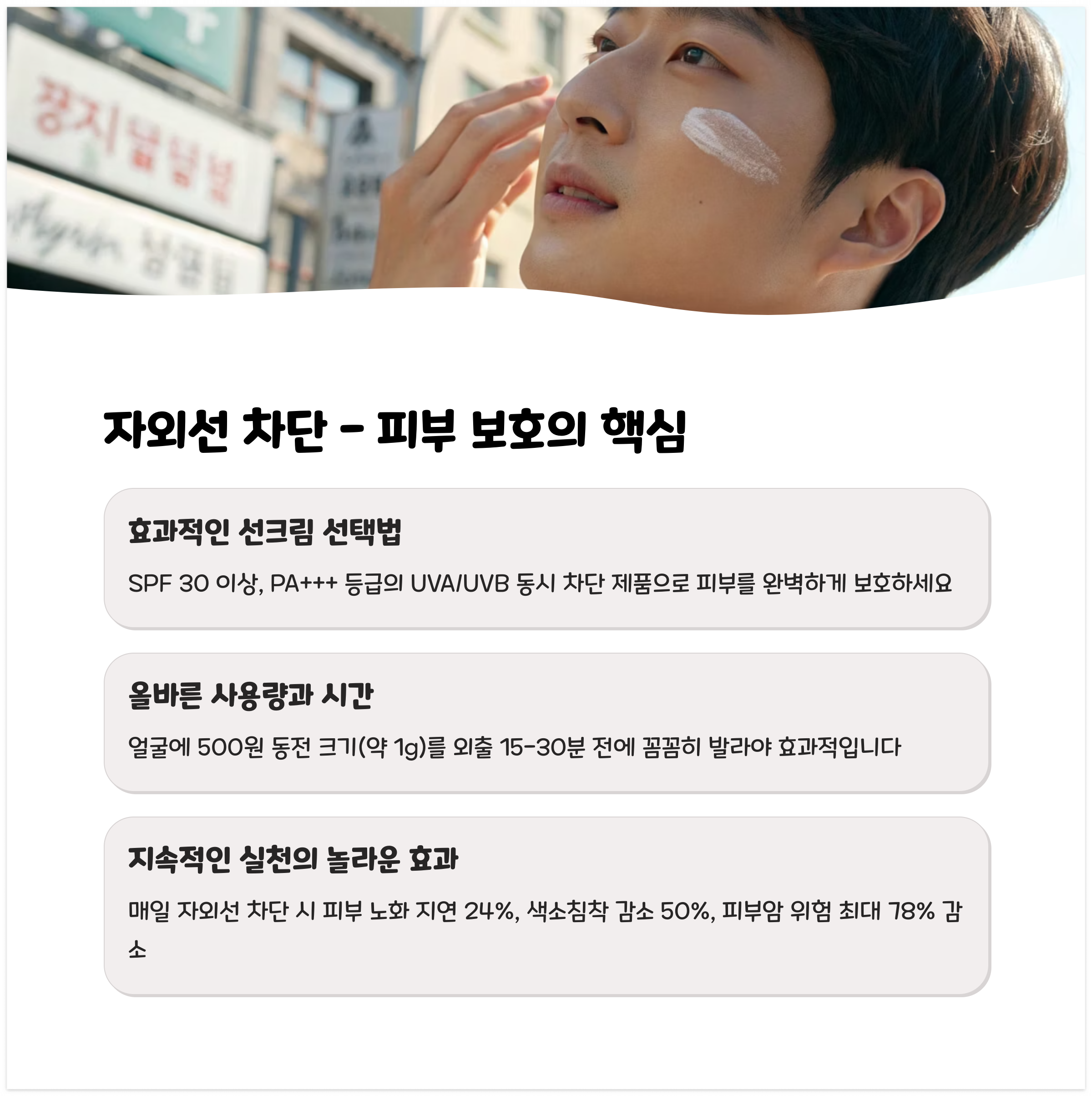 SPF 30 이상 제품을 매일 아침 바르고, 야외 활동 시 2~3시간마다 덧발라야 효과적입니다.