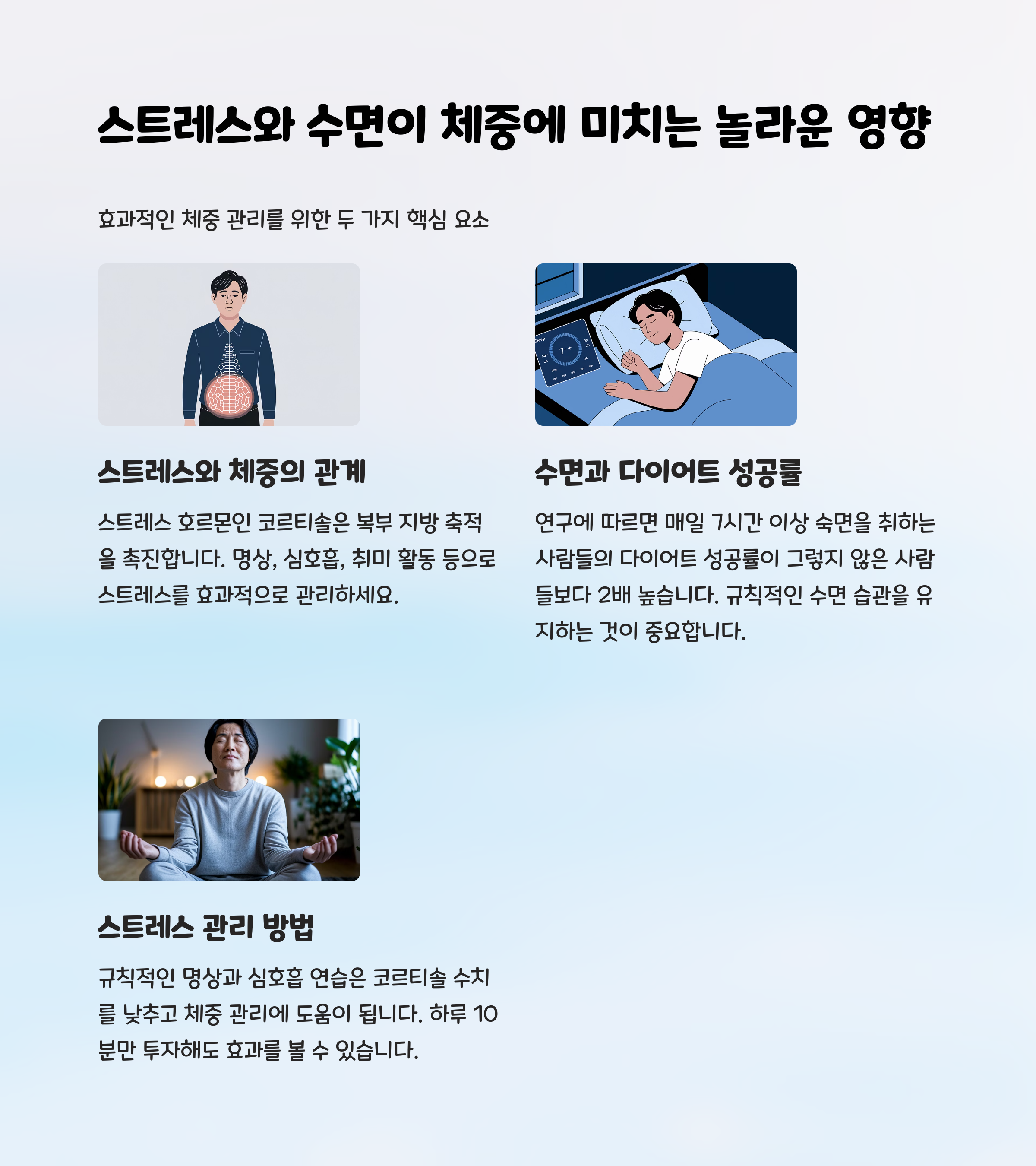 수면 7시간 이상, 명상이나 가벼운 운동으로 스트레스를 관리하세요.🌙