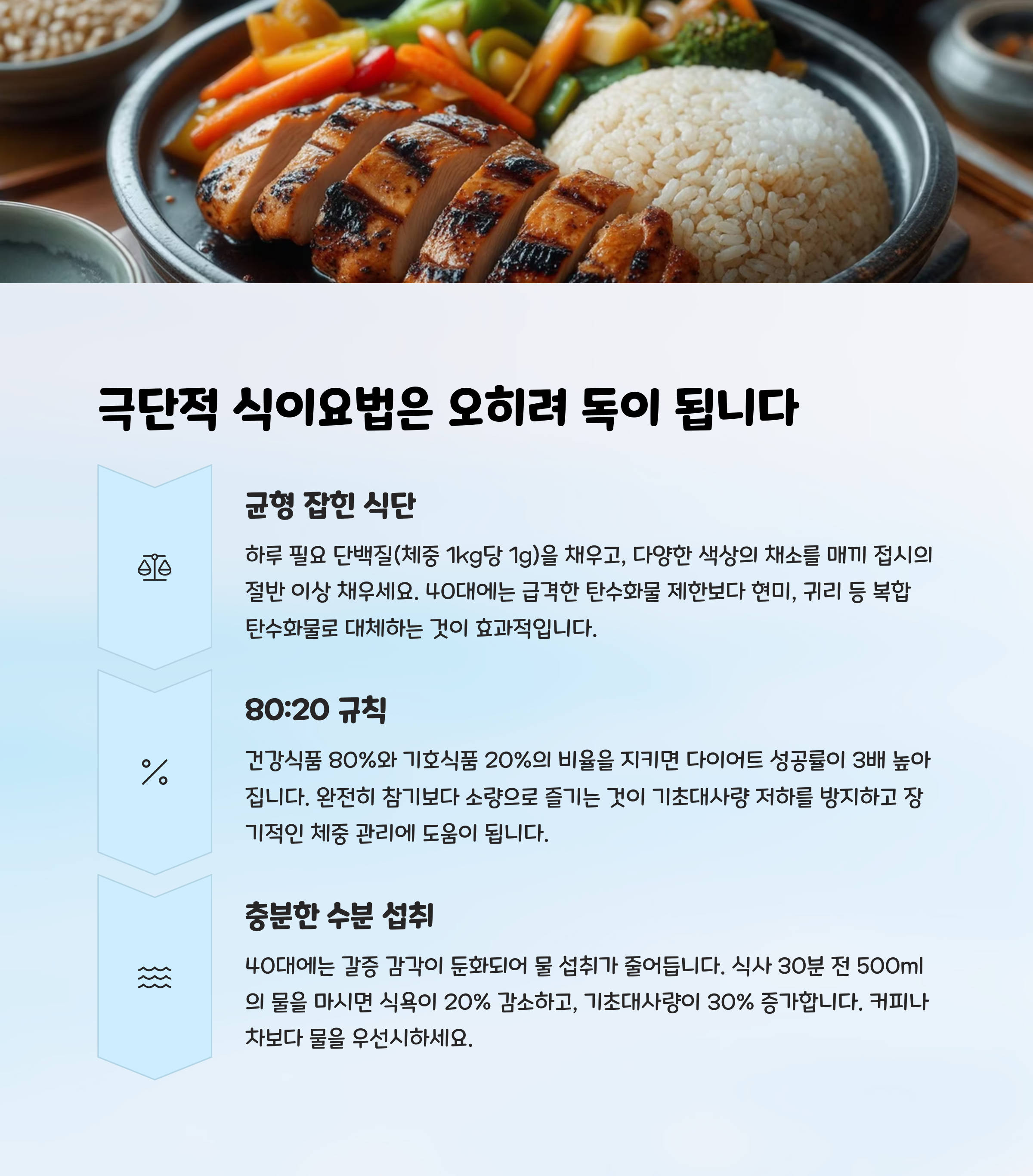 "단백질, 좋은 지방, 복합 탄수화물을 균형 있게 섭취하세요."