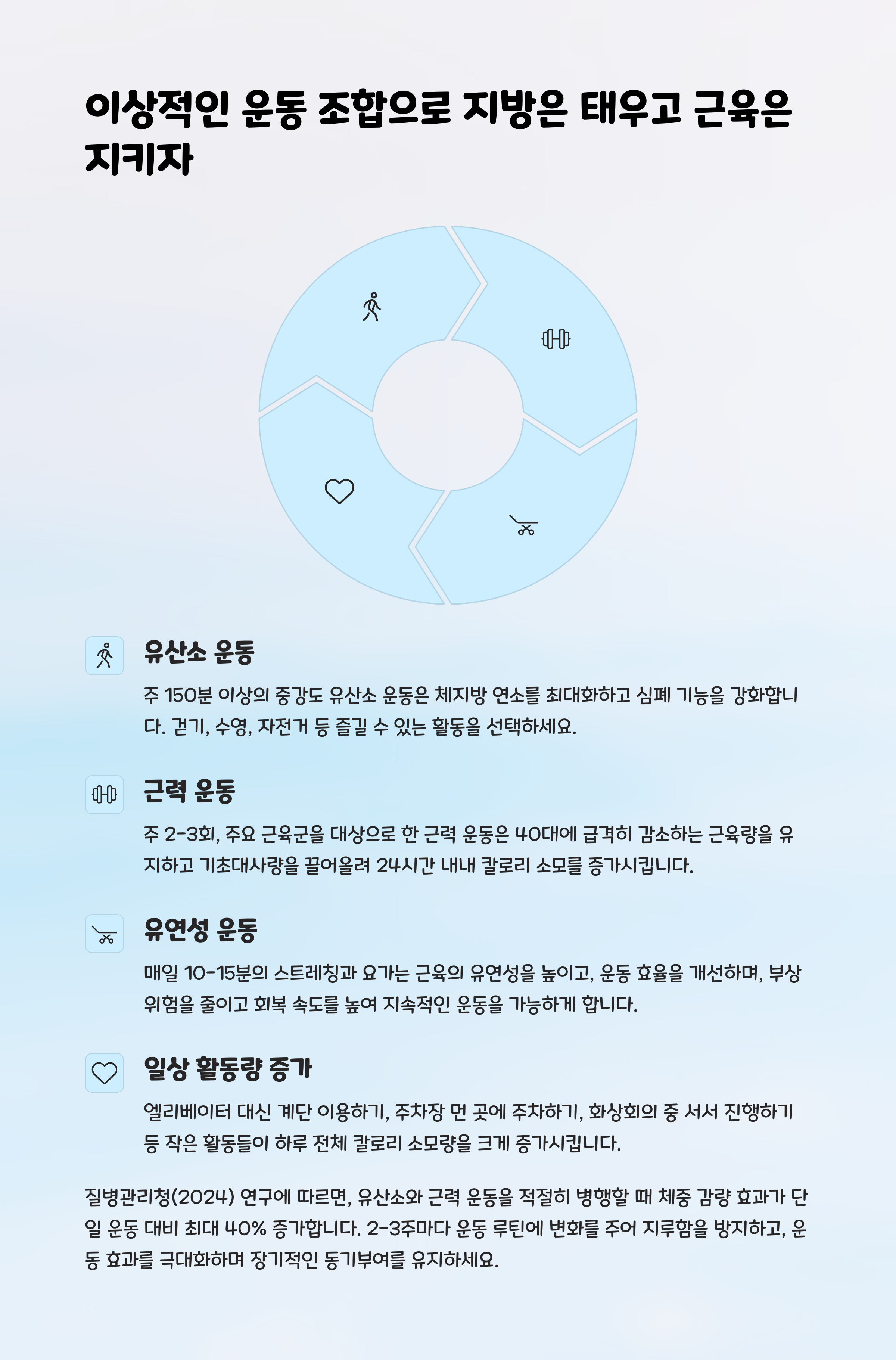 유산소 운동은 체지방을 줄이고, 근력 운동은 기초 대사량을 높입니다.