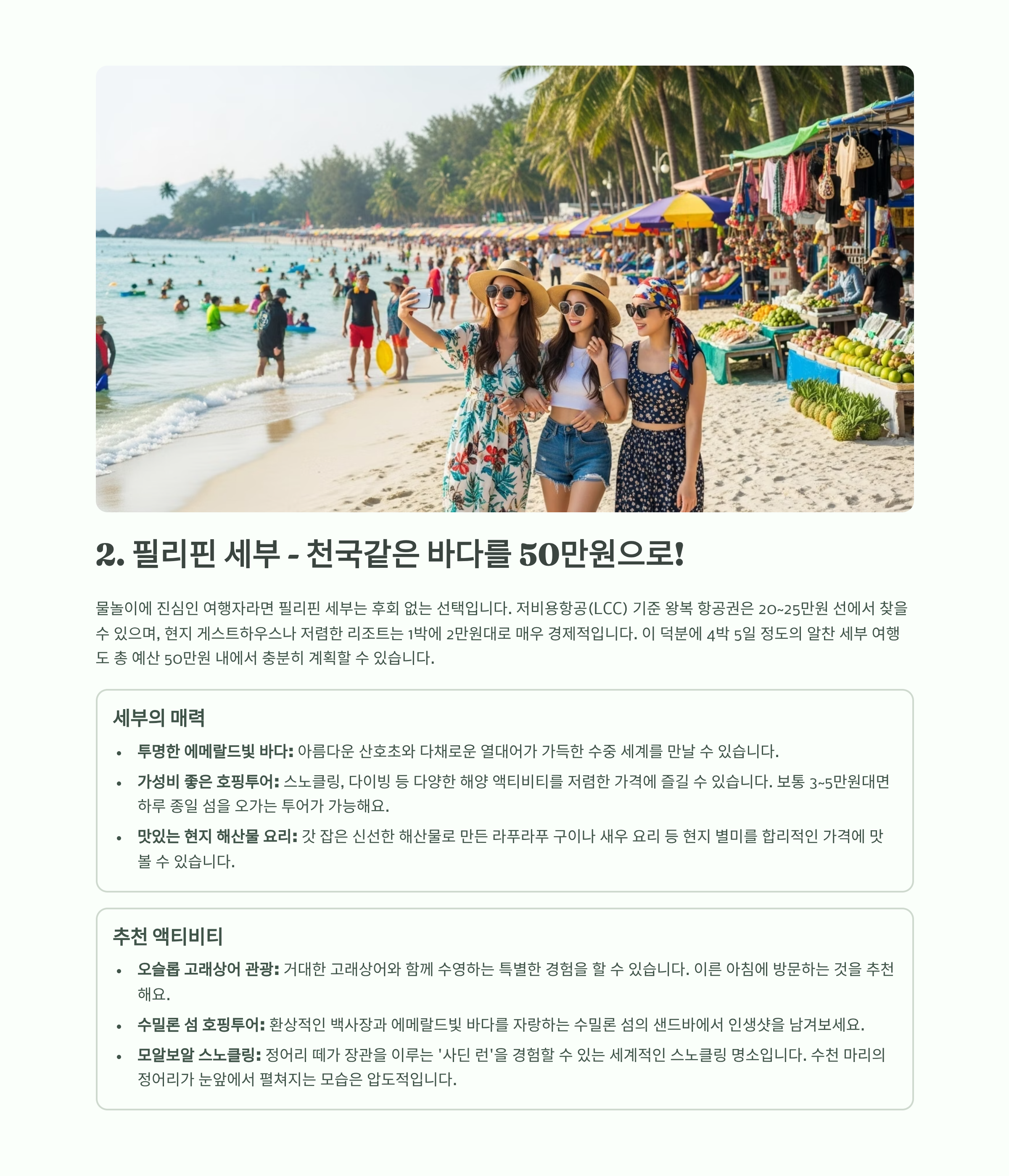 | 세부 | 약 25만 원 | 약 2만 원 | 해양 액티비티 중심 |