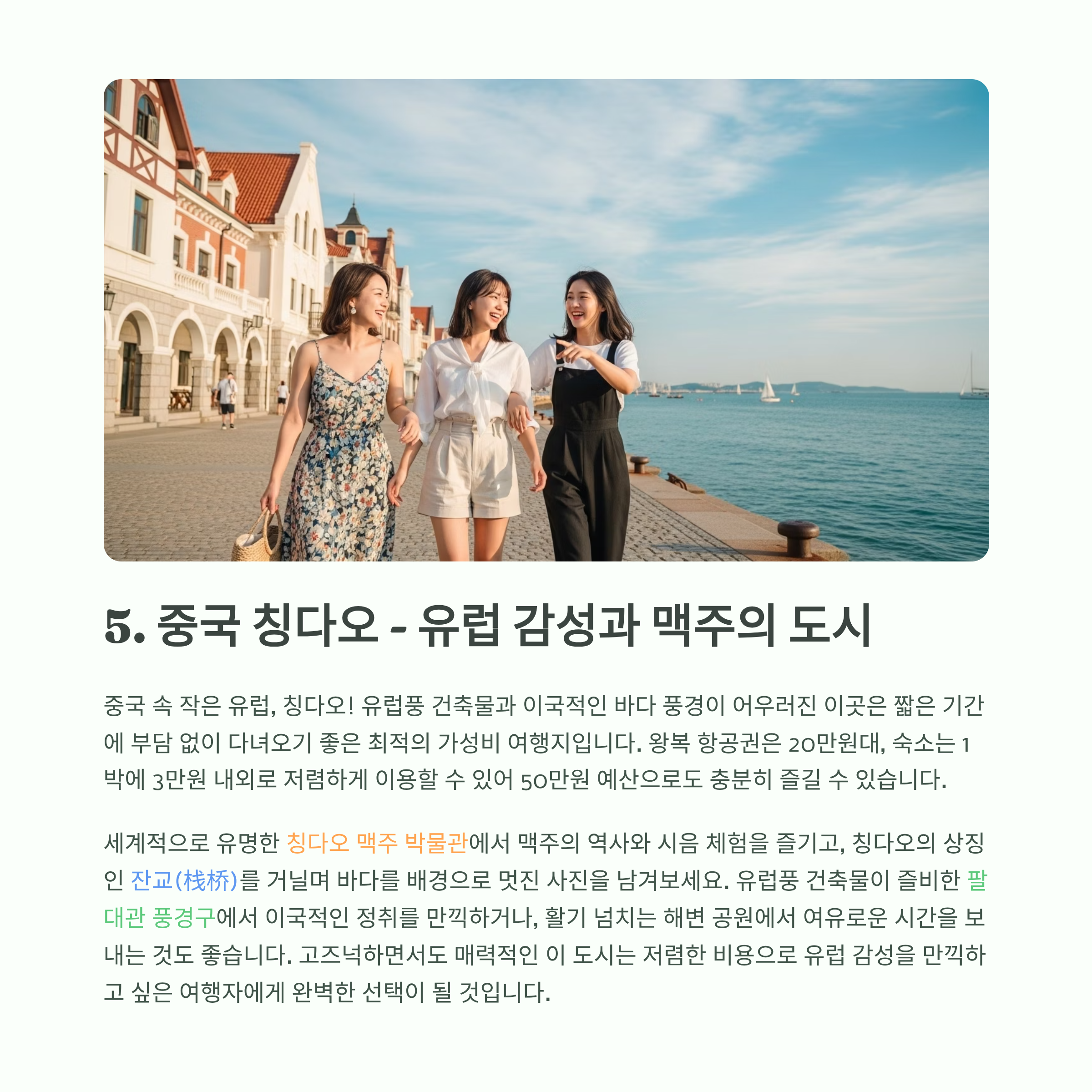 | 칭다오 | 약 20만 원 | 약 3만 원 | 유럽 감성 + 맥주 |